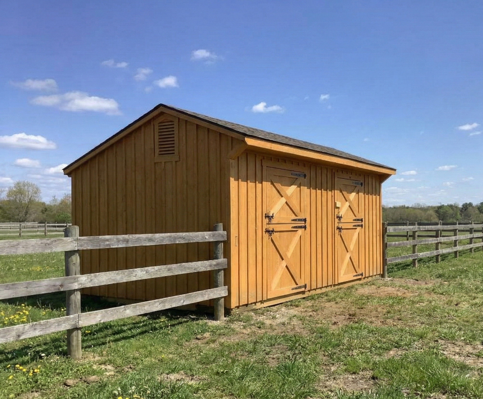 This 10Ă—20 barn features two spacious 10Ă—10 stalls, durable pine board & batten siding, and lifetime architectural shingles for lasting performance. Built with 4′ oak kickboards, Dutch doors, sliding windows, and a 70 PSF snow load rating, it offers reliable shelter with classic style and quality craftsmanship.