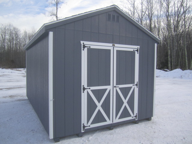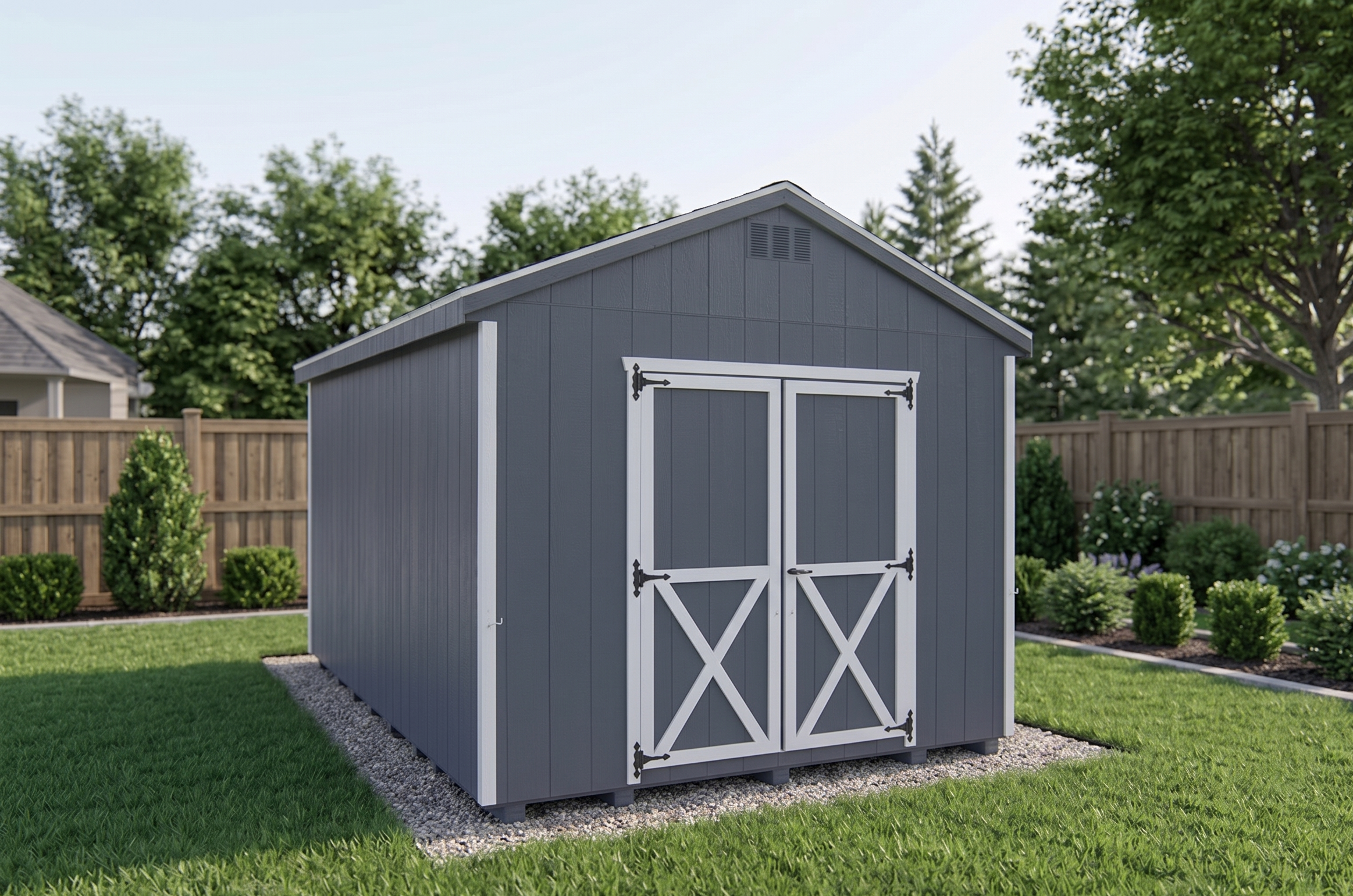 This 10×16 storage shed offers a spacious and dependable solution for organizing tools, equipment, and seasonal items. Built with quality materials and designed for durability, it provides reliable protection from the elements. Its practical layout and easy-access entry make it a functional, attractive addition to any property. Features includes a 2′ wide work bench, double doors, and a pressure treated ramp.