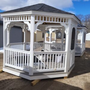 Create your new favorite outdoor retreat with our 12′ Octagon Classic Vinyl Gazebo. Featuring low-maintenance vinyl, durable composite floor, lifetime shingles, screened protection from bugs, and optional electrical package, it’s ideal for shaded gatherings, waterfront views, or backyard relaxation with included Maine delivery.