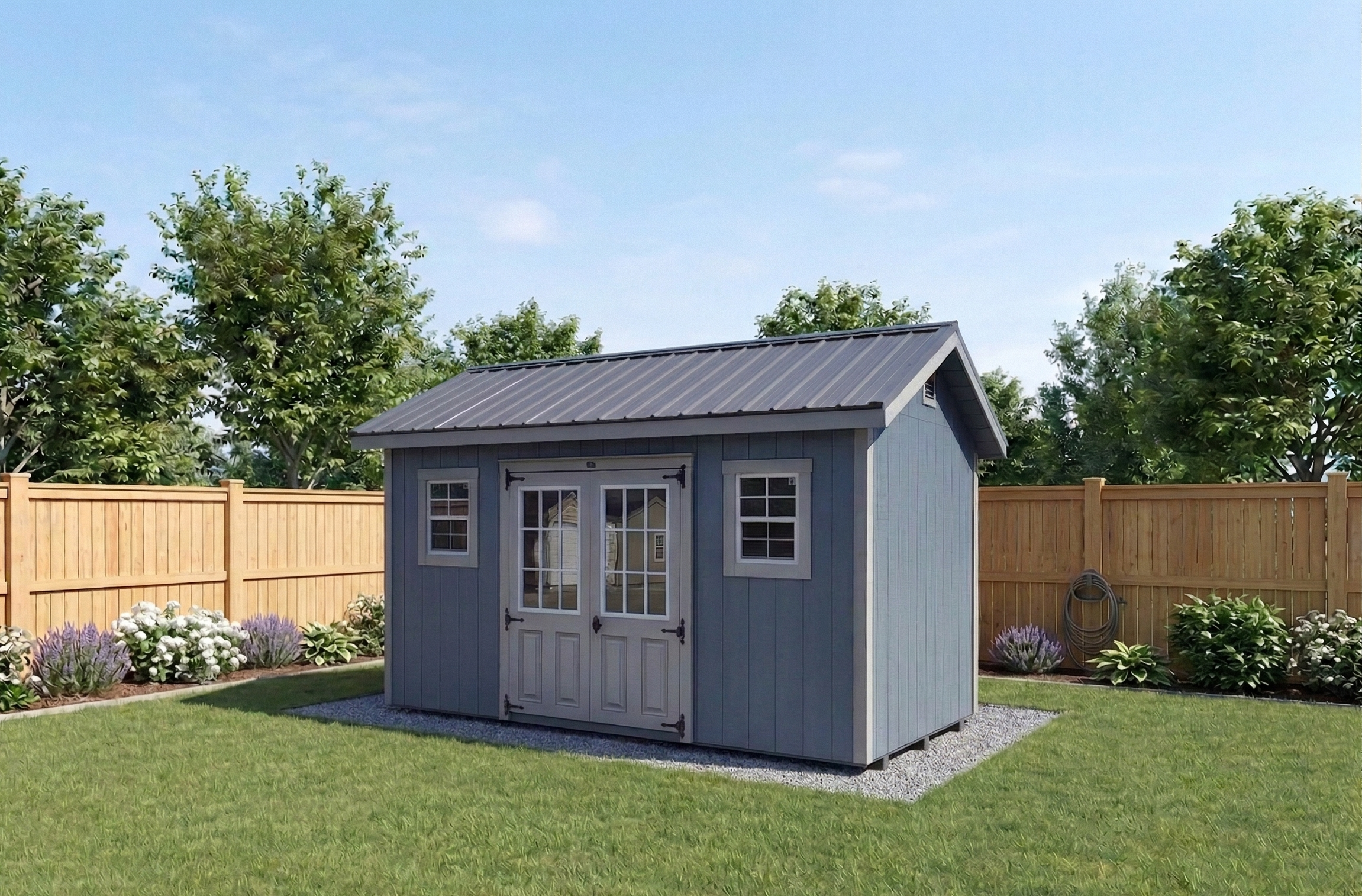 Maximize your storage with this versatile 8×14 shed, with room for tools or equipment. Built with durable materials, it features sturdy double doors for easy access, built in ventilation, and windows for natural light.