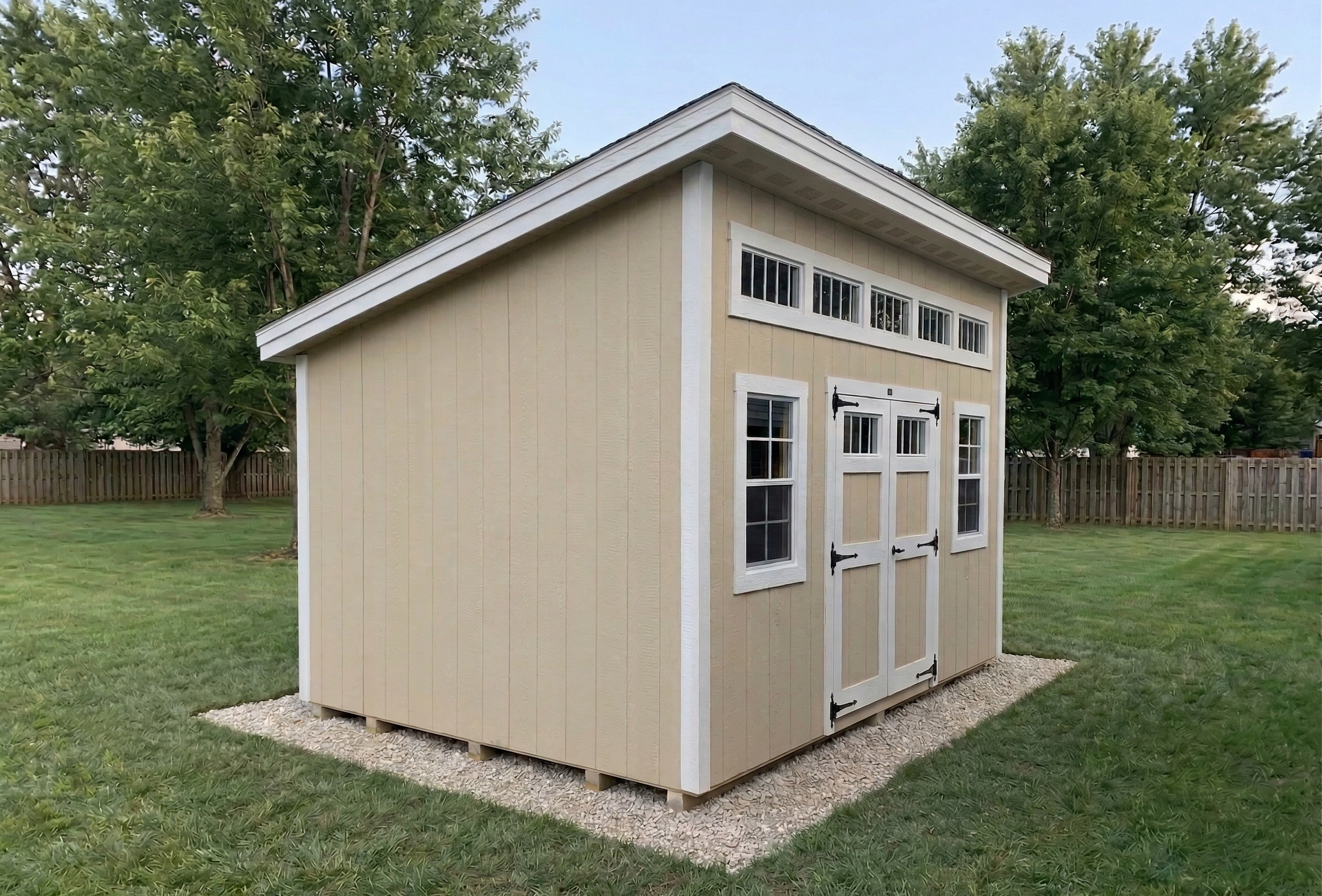 A spacious 10Ă—16 storage building with tall walls, wide double doors, a ramp and large windows for light. Built strong for tools, equipment, or yard gear, it gives you roomy, easy-access storage with durable construction and Maine delivery.