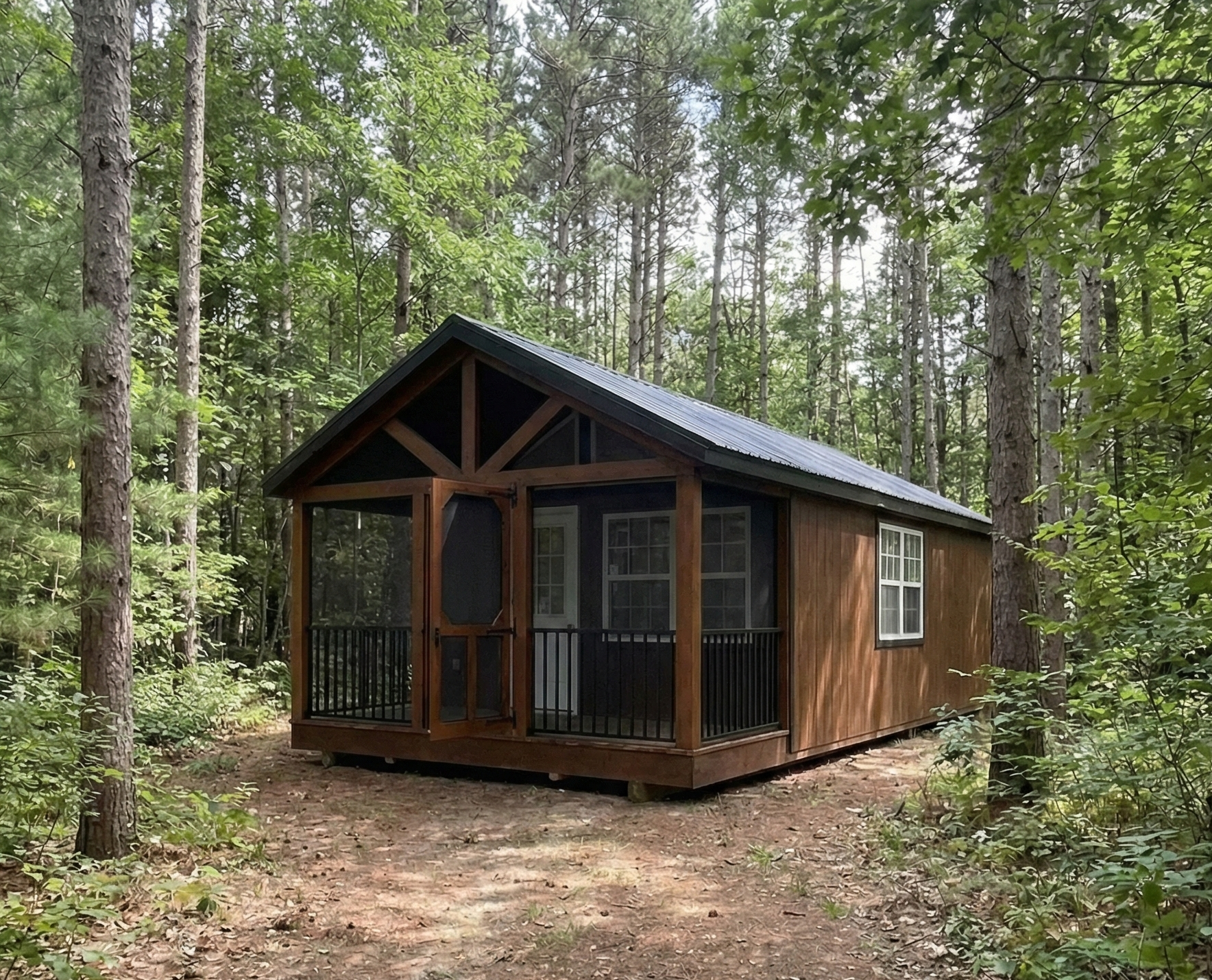 A finished 14×32 Acadia Classic camp, featuring a 6-foot screened porch, cathedral ceiling, electrical, plumbing, and a kitchen — all ready to make this your home away from home. Perfect for weekend retreats, hunting trips, or guest stays with durable construction and delivery across Maine.