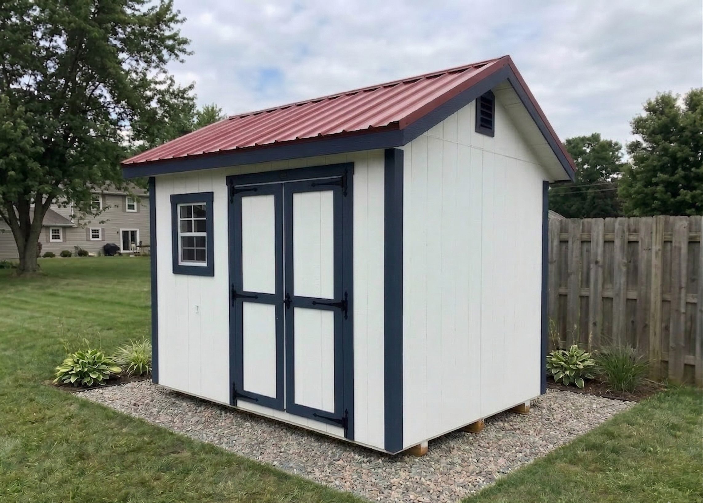 This compact 8×10 storage shed is a practical solution for organizing tools, lawn equipment, and seasonal items. Built with durable materials, it features sturdy framing, a weather-resistant roof, and wide double doors for easy access. Its efficient footprint makes it a great fit for smaller yards.