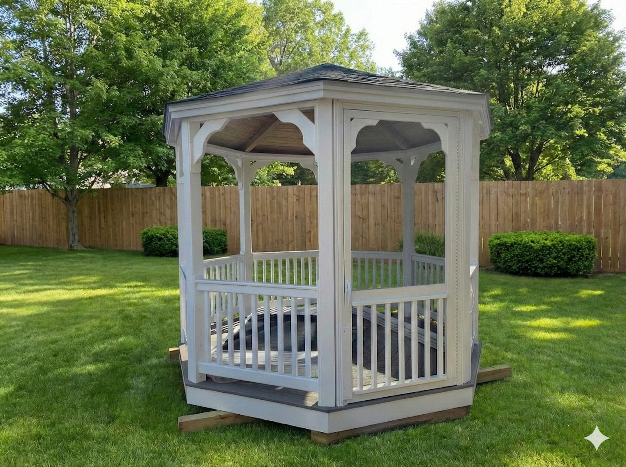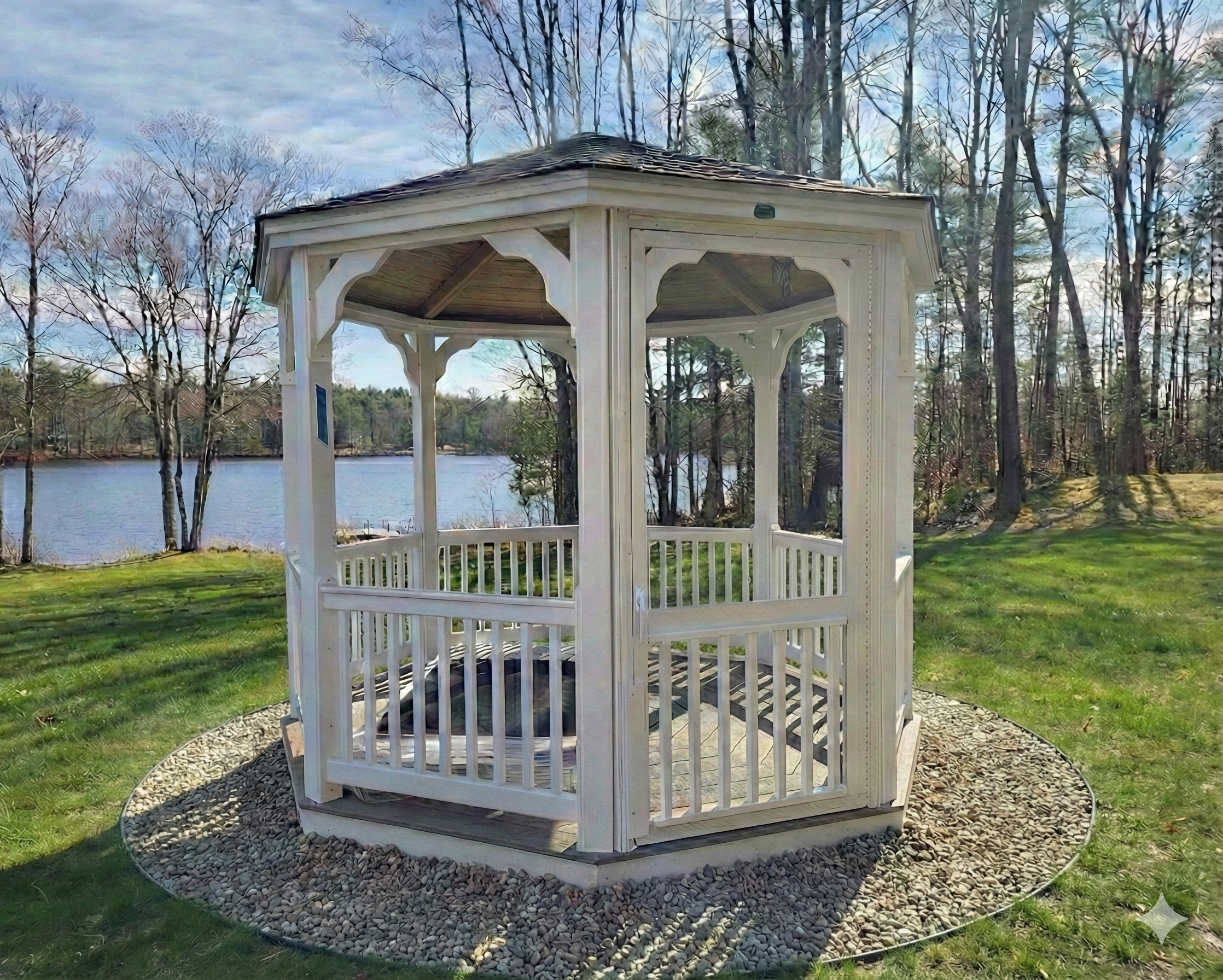 This 10′ gazebo offers screened protection from bugs, a durable lifetime architectural roof, and sturdy posts with composite flooring — perfect for outdoor relaxation and entertaining. Delivery across Maine brings this gazebo right to your back yard.