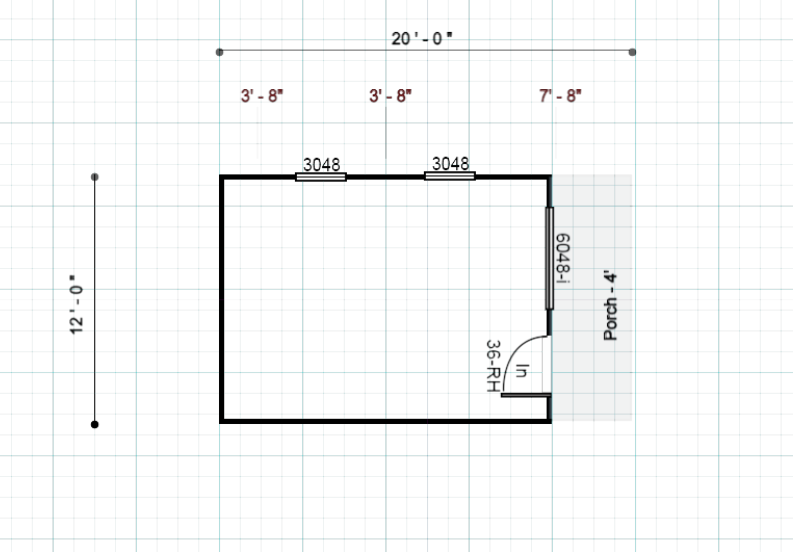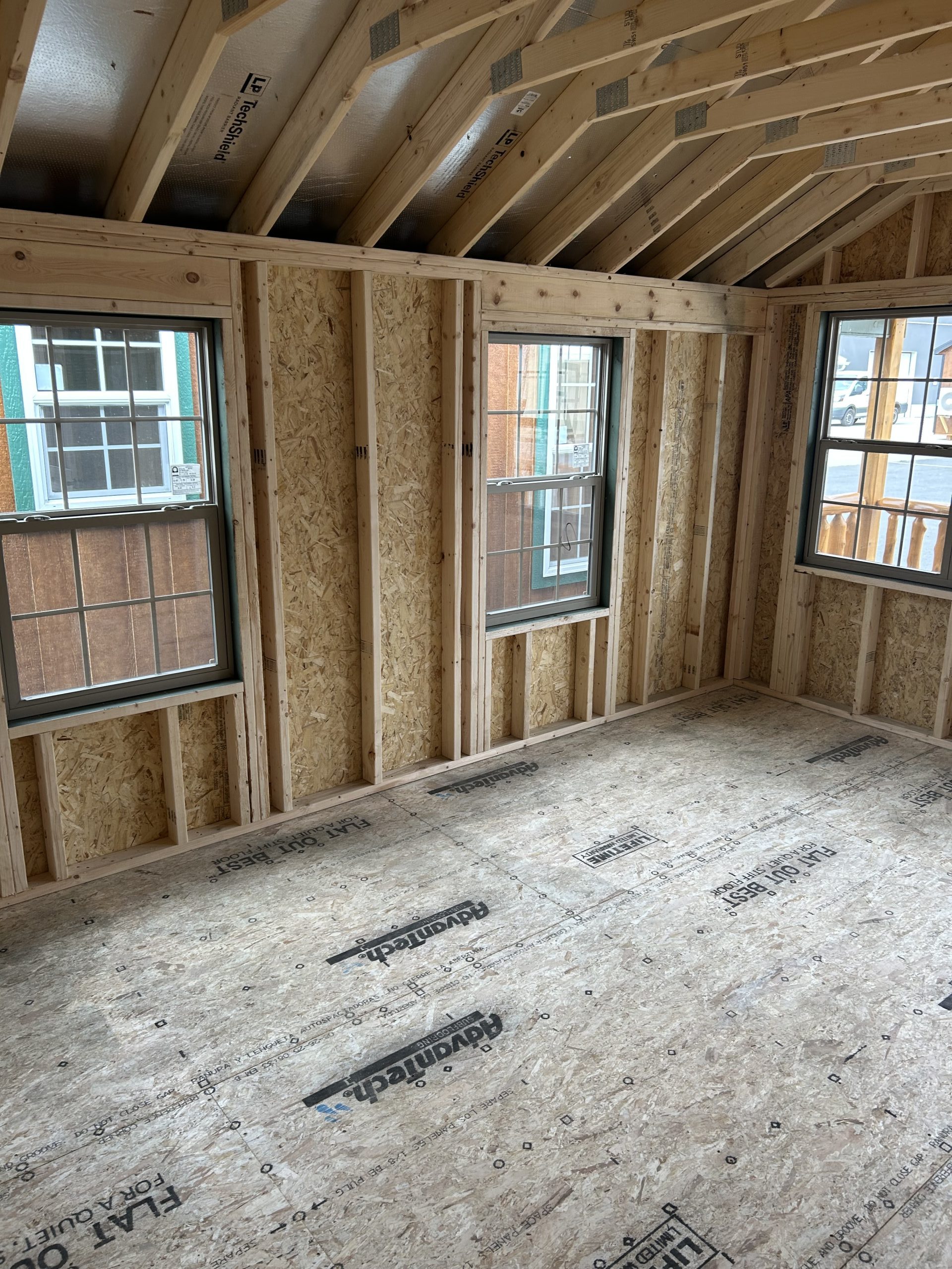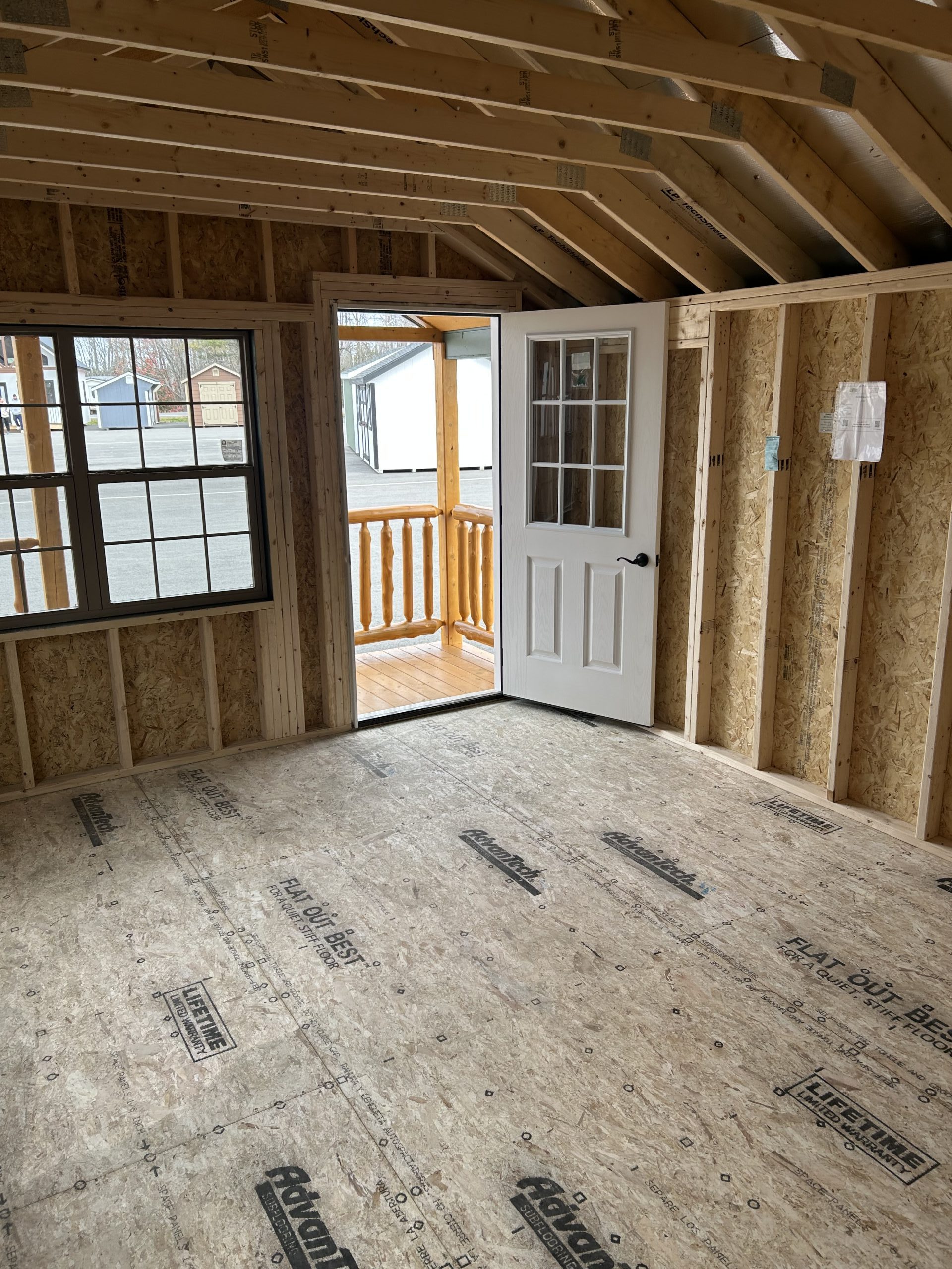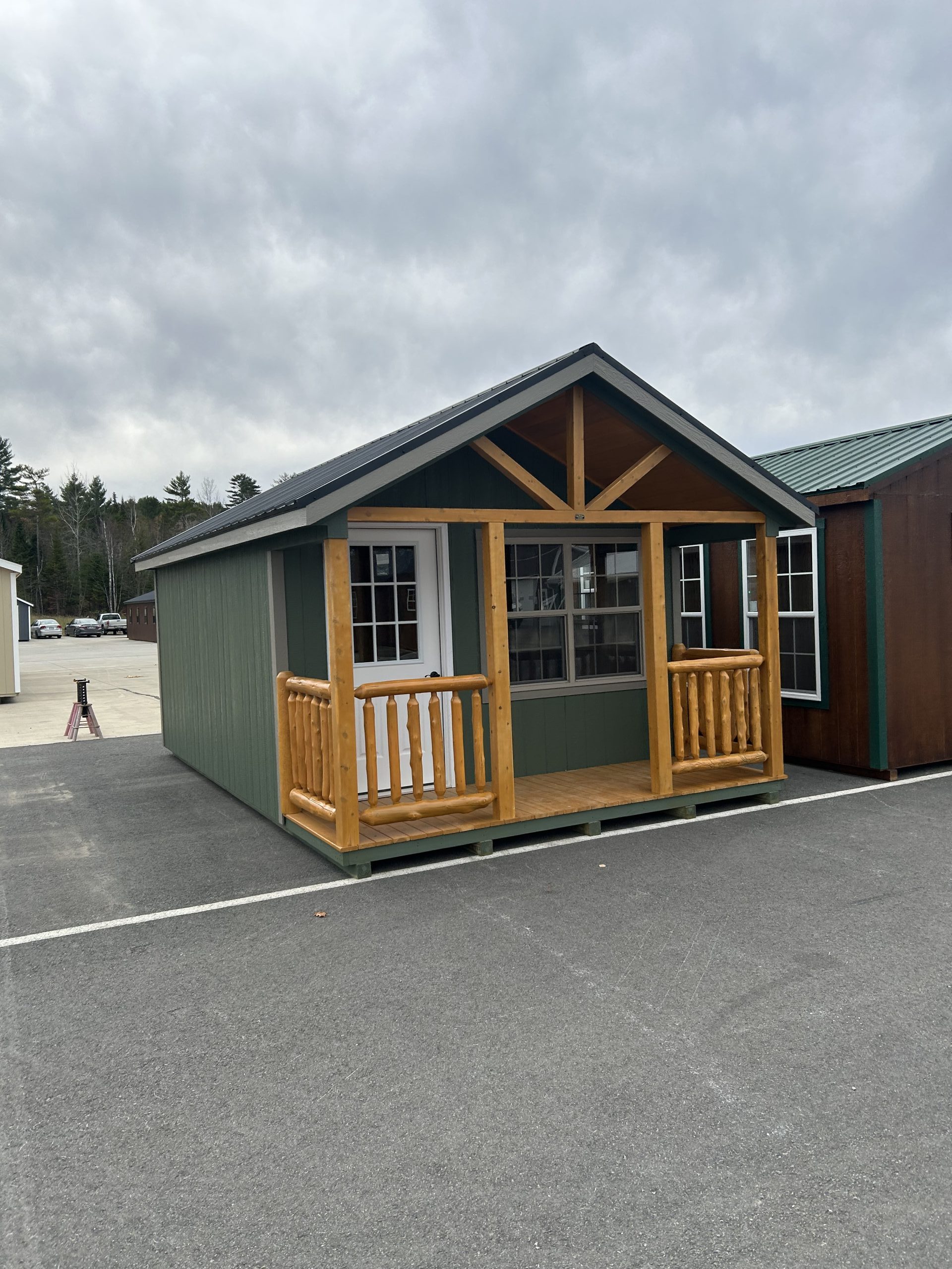 Size:Â 12×20 Building color: Pequea Green Trim color: Clay Roof color: Black Metal This Acadia Camp Includes 4 foot porch Insulated Floor 7 inch soffit overhang 7 inch gable overhang 3 Windows