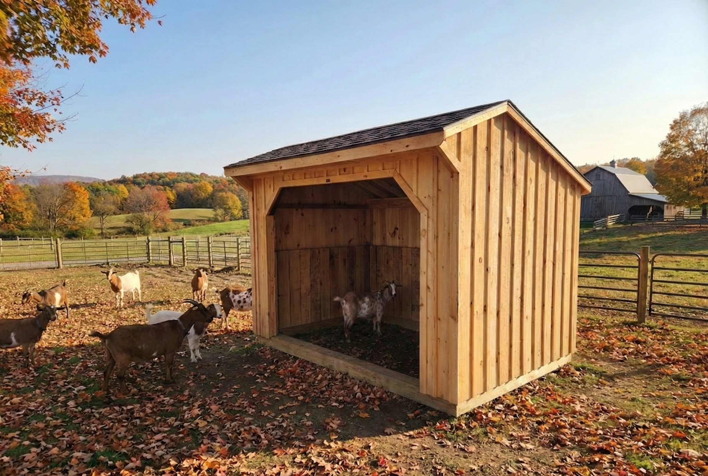 This 8Ă—12 run-in barn delivers classic design and dependable shelter with sturdy white pine board & batten siding, a wide run-in opening, and lifetime architectural shingles. Perfect for horses, goats, or other animals, it provides shelter from sun or snow. Flexible rent-to-own options are available, and Maine delivery is included.
