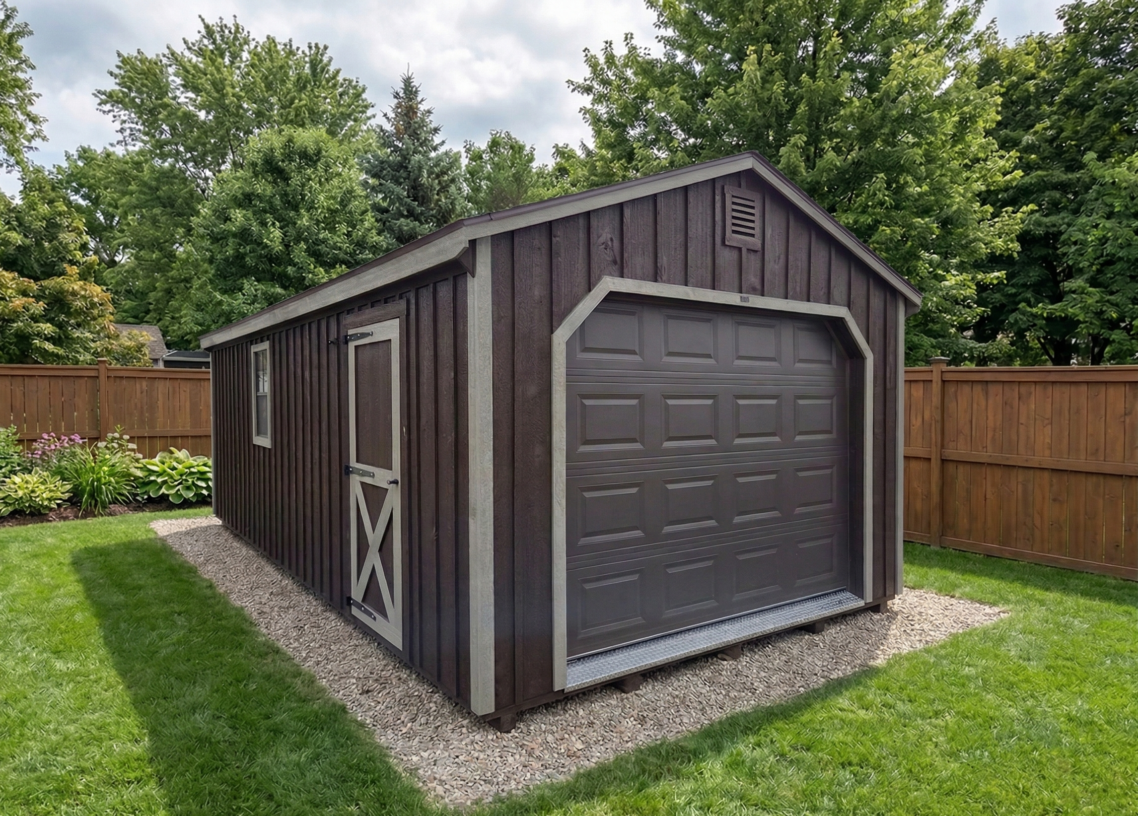 This spacious 12×24 garage offers dependable storage and protection for your vehicle, equipment, or recreational gear. Built on 5 pressure treated skids, it features post and beam style framing, beautiful board and batten siding, a 9×7 overhead door, a side entry door, and windows for natural light.