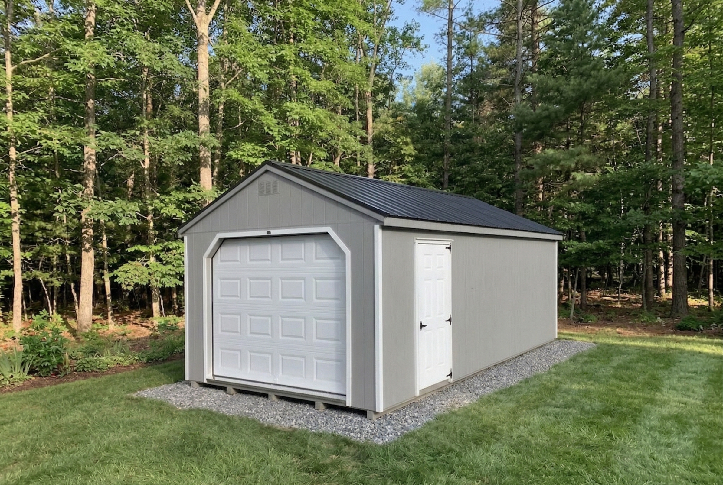 This 12×24 garage offers space and durability for vehicles, equipment, or workshop space. Built on 5 Pressure Treated skids, it features a 9×7 overhead garage door, side entry door, and a Pressure Treated ramp for ease of access. Ideal for protecting your investments while adding versatile, functional storage to your property.