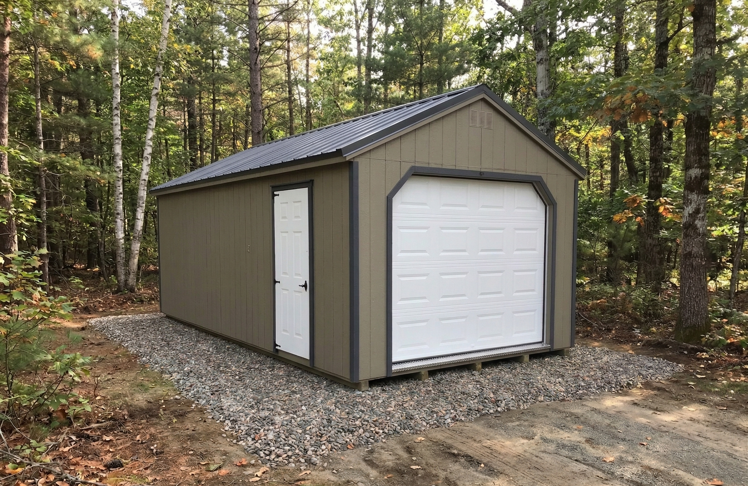 This 12×24 garage provides spacious, reliable storage for vehicles, equipment, or projects. Built on 5 Pressure Treated skids, it features a 9×7 garage door with a pressure treated ramp, a side entry door, and windows for natural light.