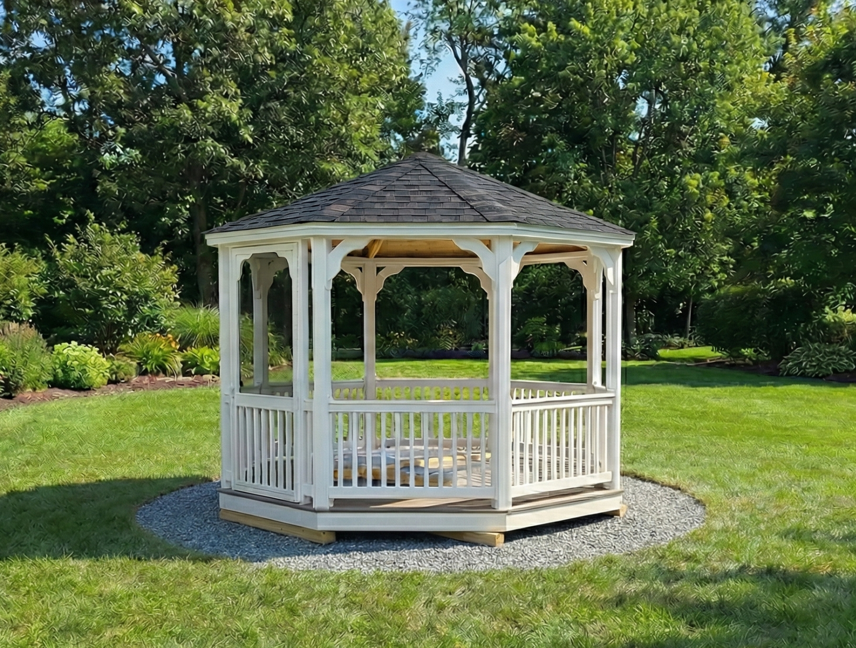 Enjoy the long summer evenings in this 12′ Vinyl Gazebo — featuring lifetime architectural shingles, a durable composite floor, and a full screen package. Perfect for relaxing, dining, or entertaining outdoors while adding shade, charm, and lasting value to your backyard.