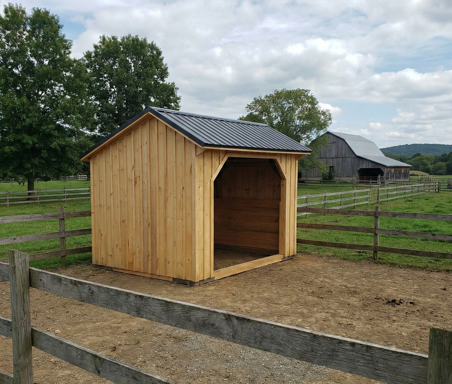 This 10Ă—12 run-in barn features 2Ă—4 framing, a pressure-treated hemlock base, and a metal roof. A wide, run-in opening allows your animals to move freely, escaping the rain or sun. An easy, practical solution to your sheltering needs.