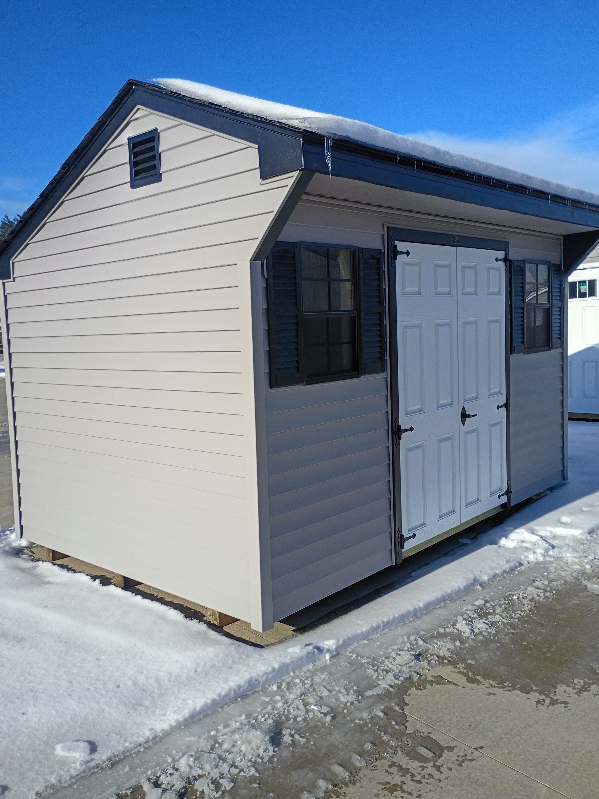 This 8Ă—12 Cottage shed with traditional vinyl siding features a Flint exterior with black trim and a two-tone black architectural shingle roof. Built for strength, it includes a 90 PSF snow load rating, double fiberglass doors with ramp, two shuttered windows, and a convenient built-in workbench.