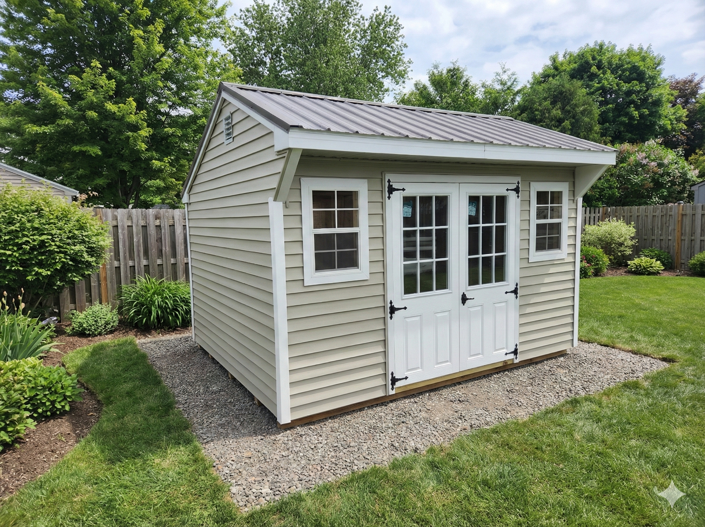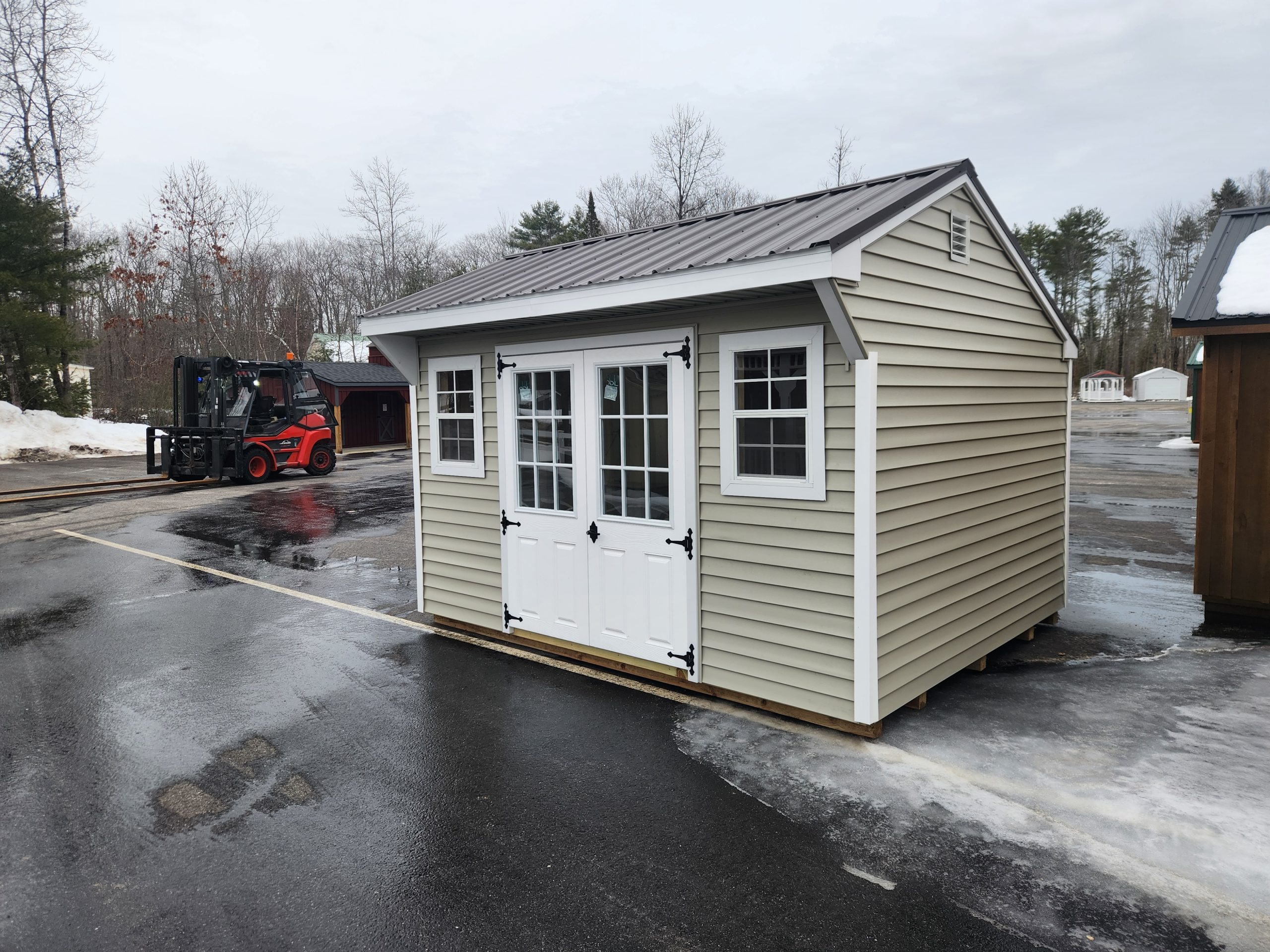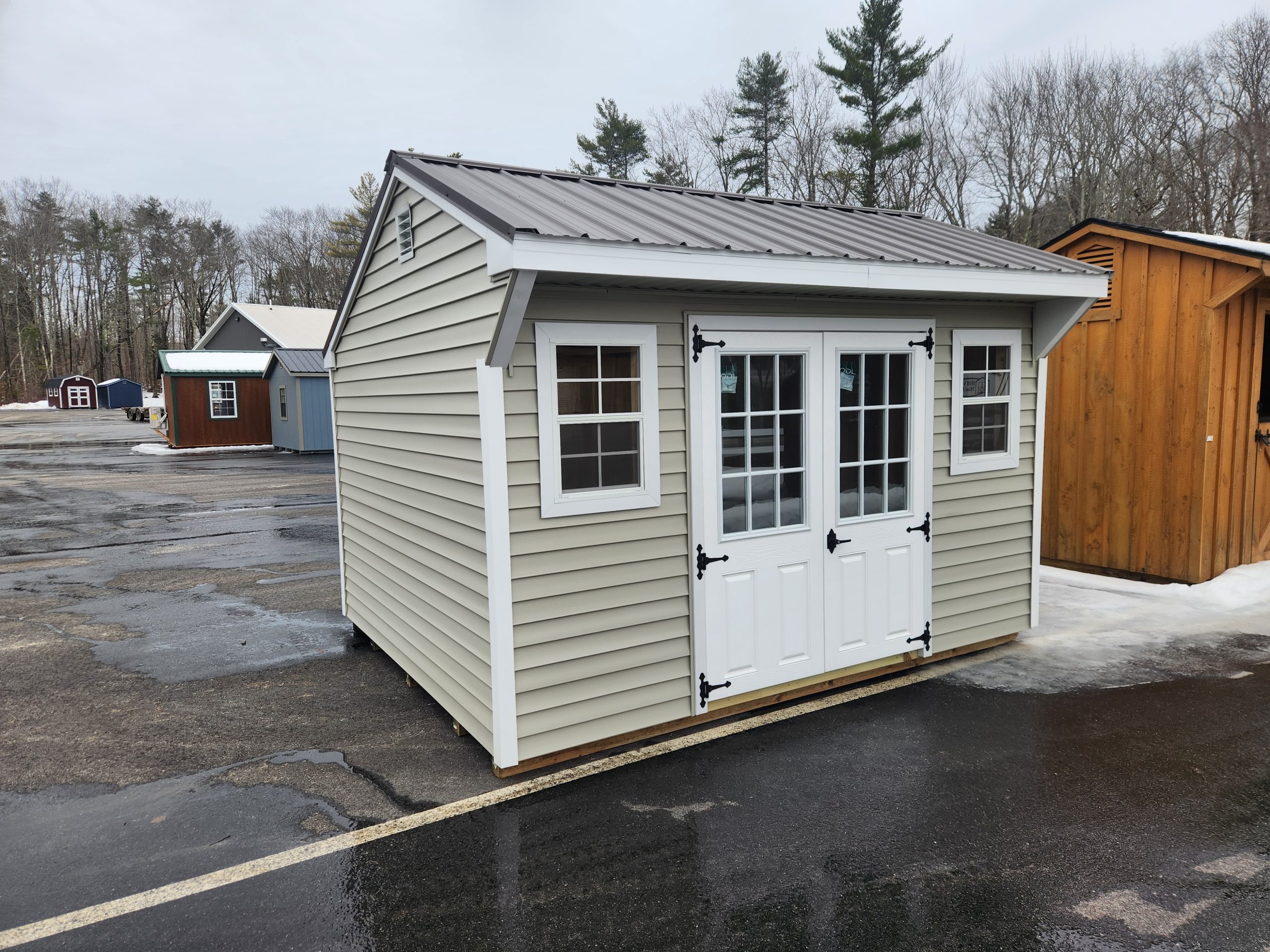 This 10Ă—12 Cottage shed with traditional vinyl siding features a olive exterior with black trim and a burnished slate metal roof. Built for strength, it includes a 90 PSF snow load rating, double fiberglass doors with ramp and two windows.