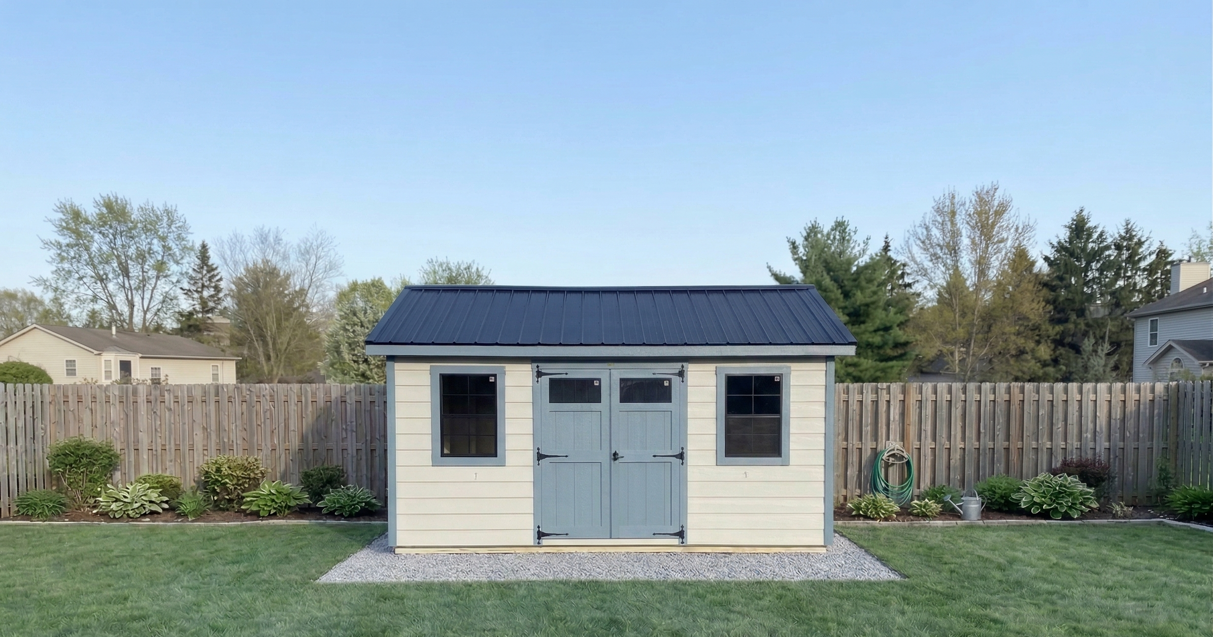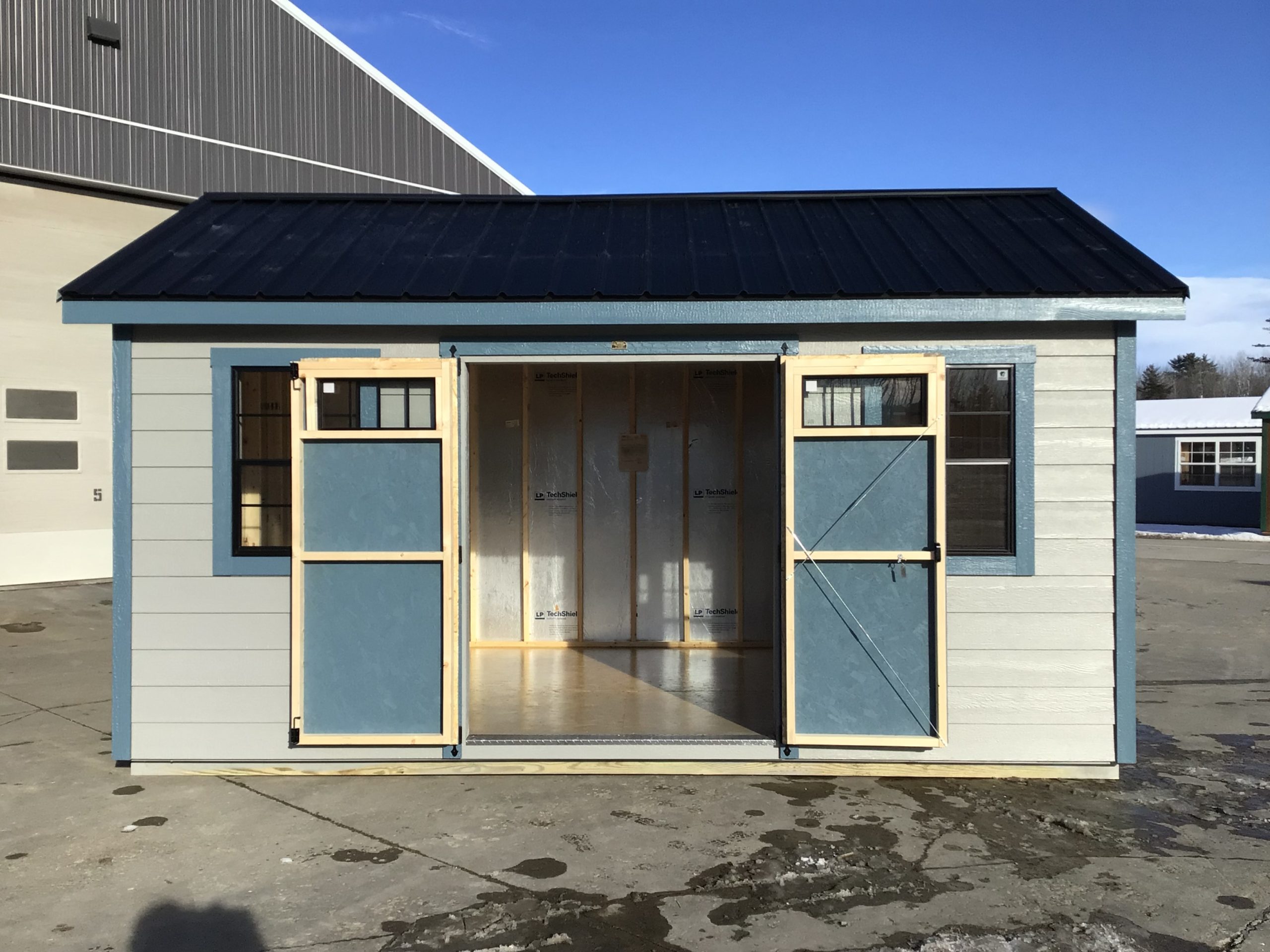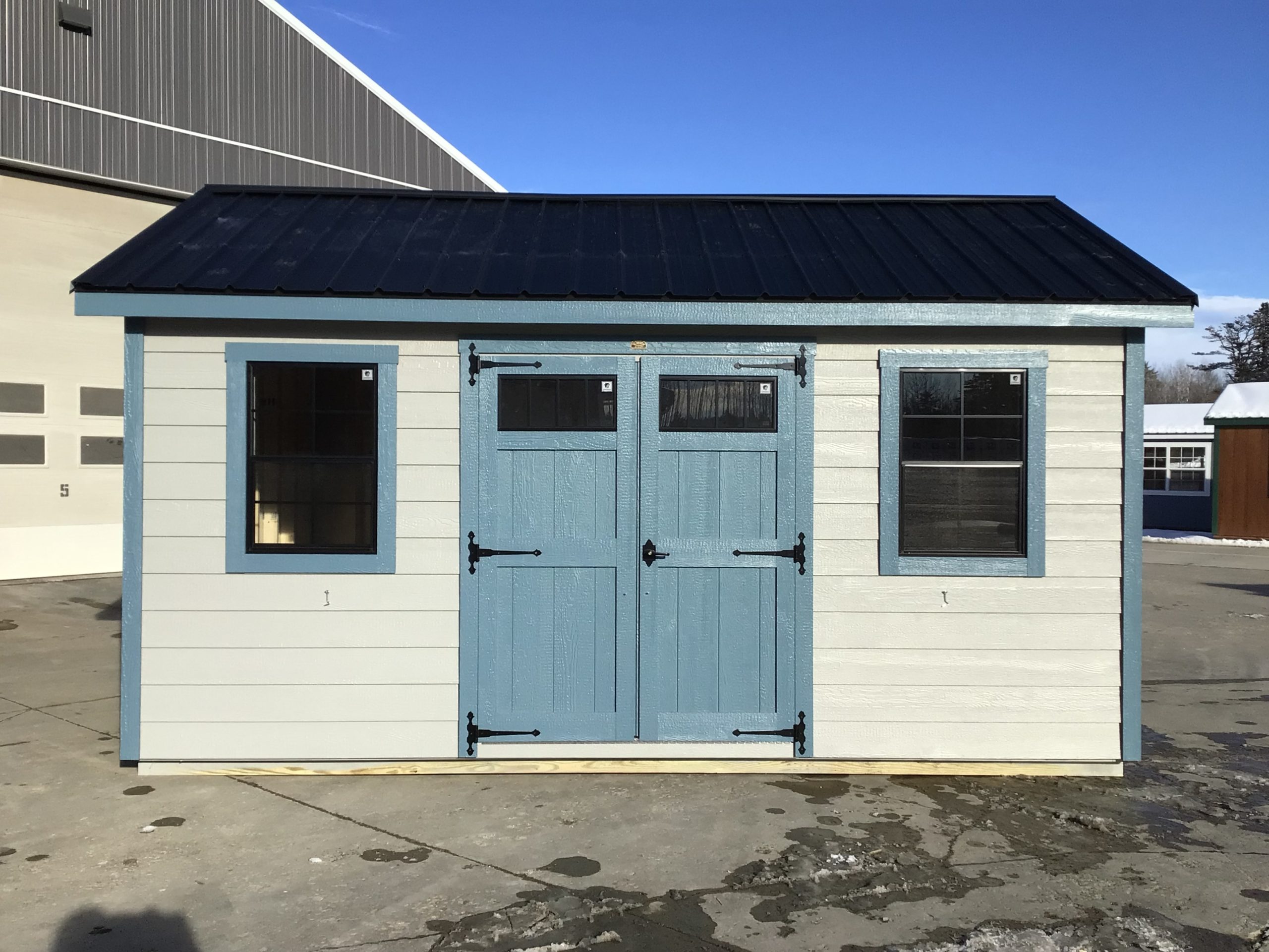This Gap Gray building features Riehl Blue trim, a durable black metal roof, a 5′ double door with ramp, two 24″ x 36″ windows for natural light, and a sealed floor for added protection and longevity.