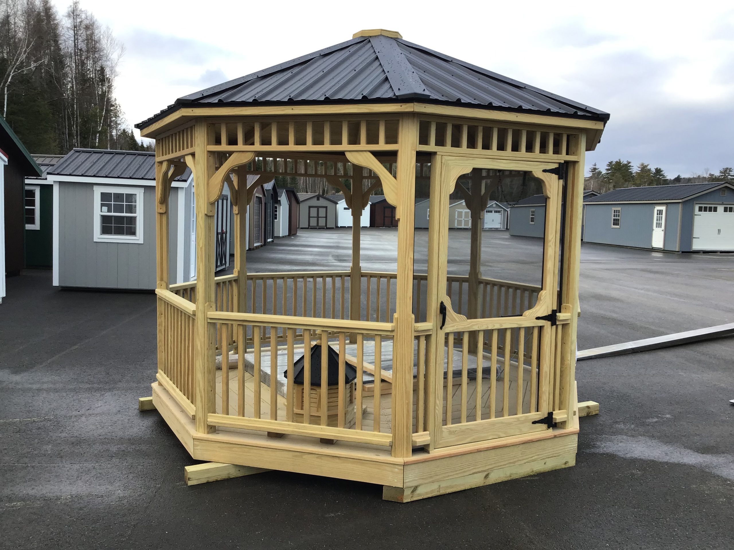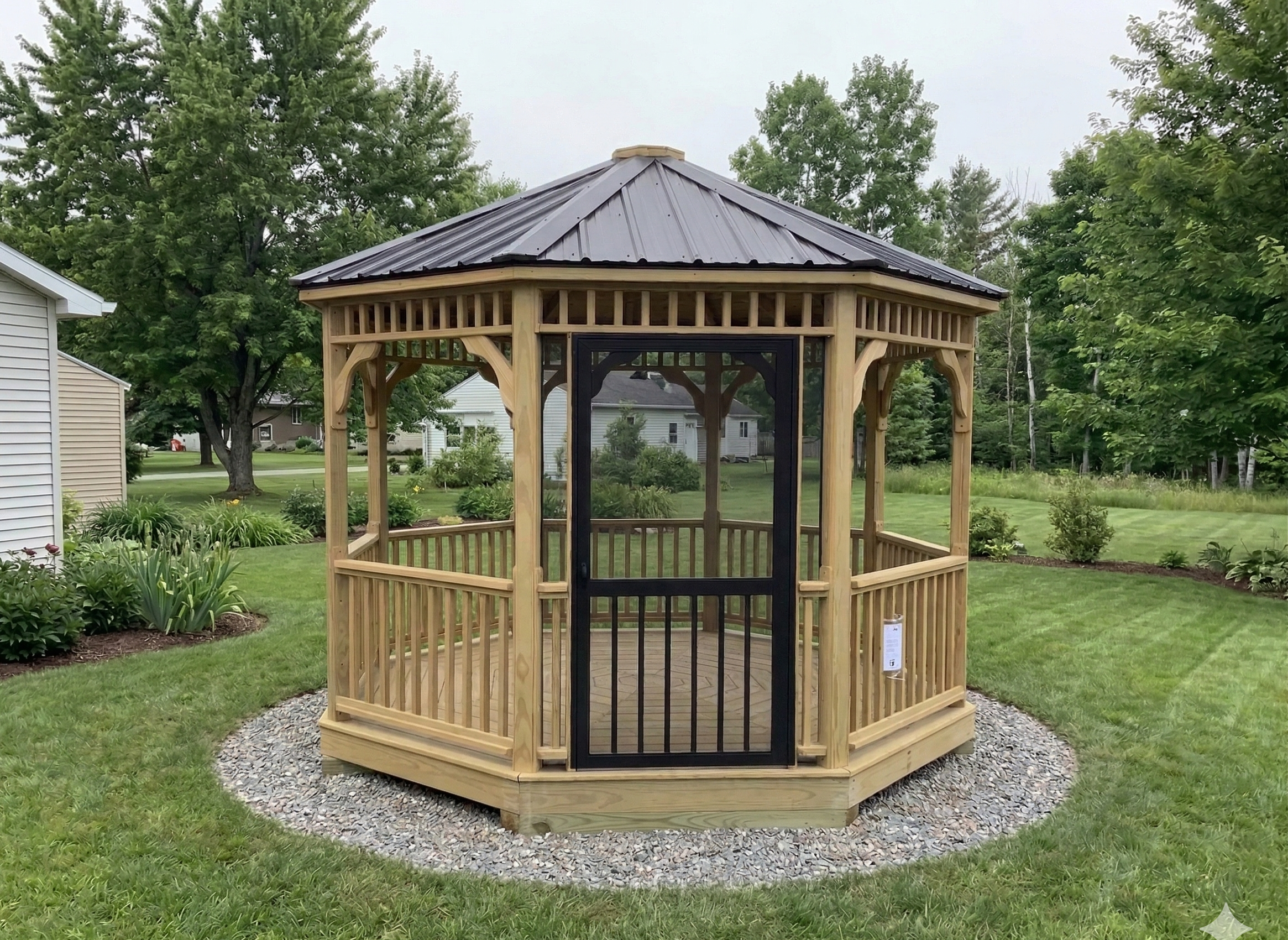 This 12′ gazebo creates a comfortable and stylish outdoor retreat, perfect for relaxing and entertaining. Featuring a turned spindle railing, metal roof, and full screen package, it makes an inviting addition to any backyard.