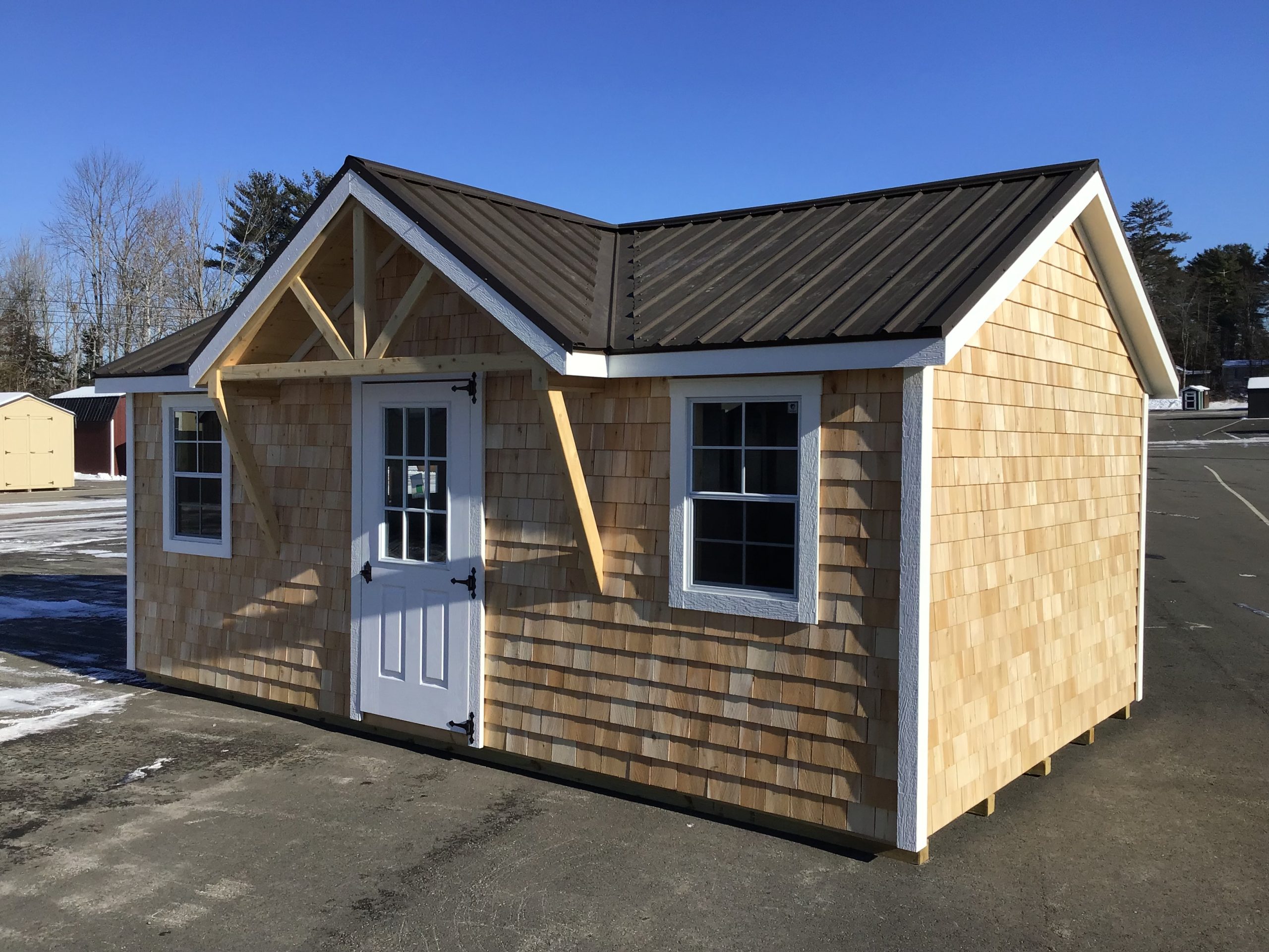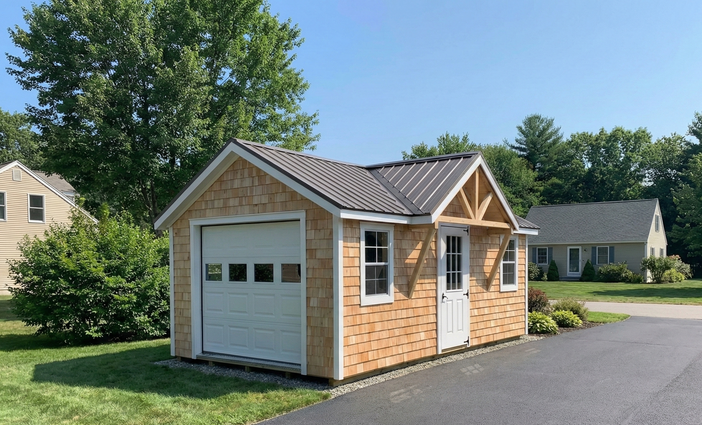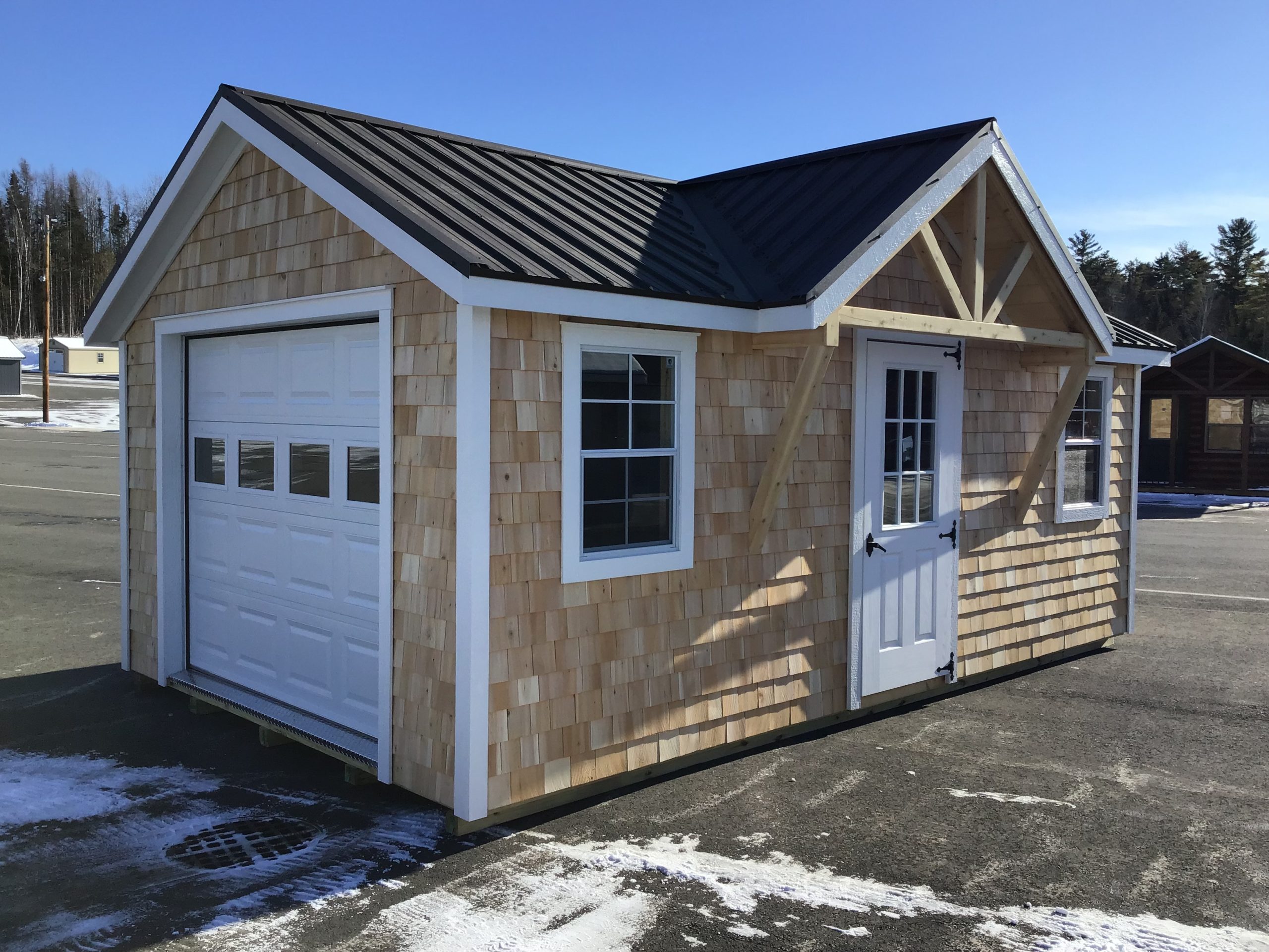 A classic A-frame garage with cedar shake siding and durable construction, perfect for Maine’s varied seasons. It includes a roomy overhead door with windows, a side entry door, solid flooring, and windows for natural light. Ideal for vehicle shelter, equipment storage, or workshop space with Maine delivery included.
