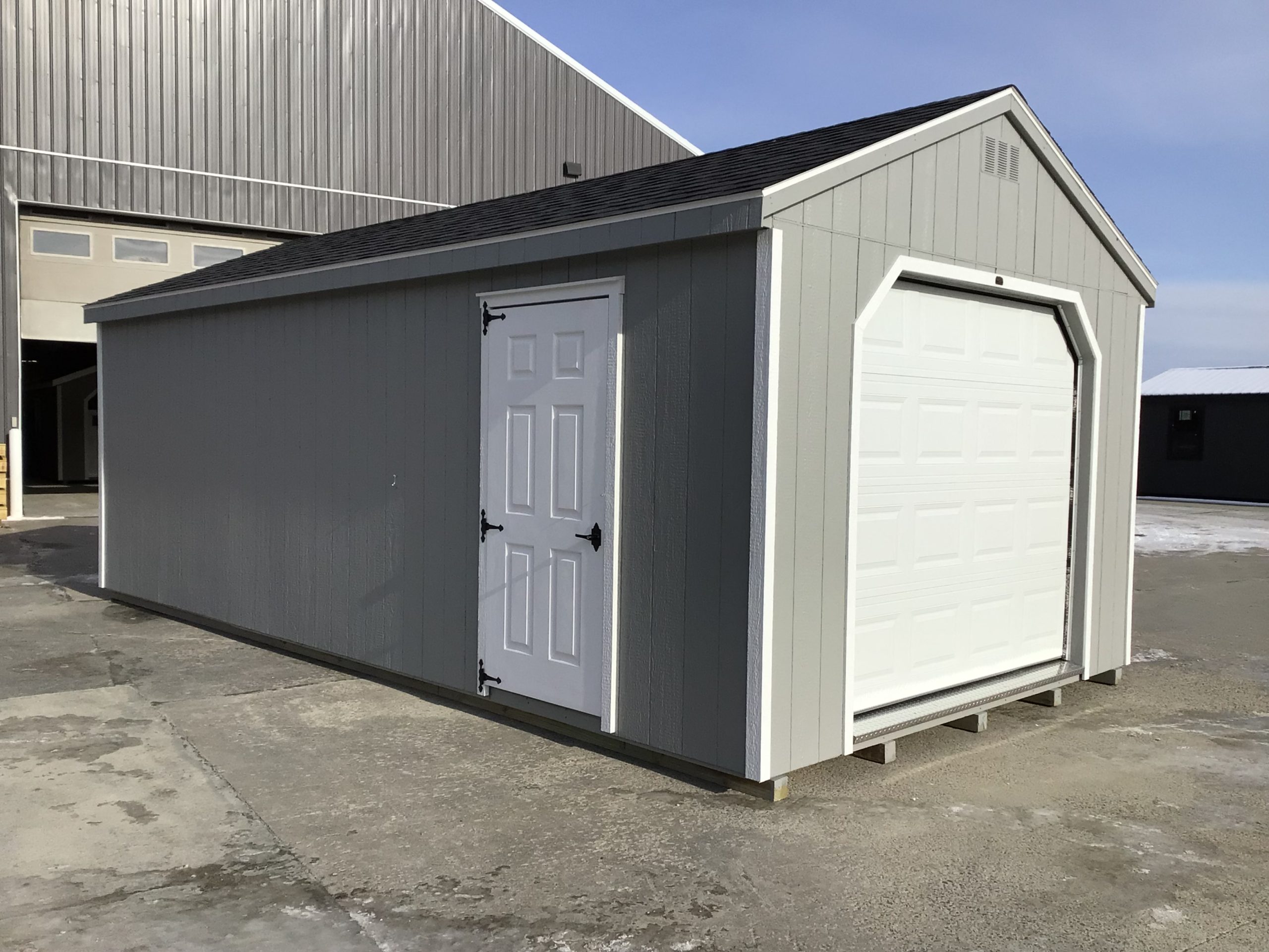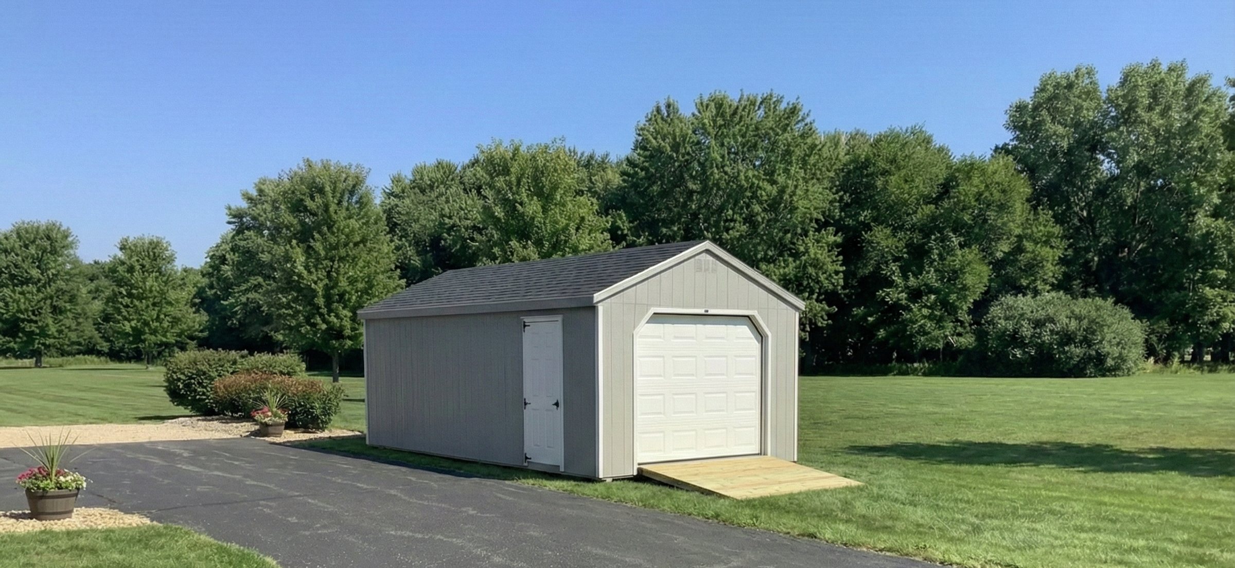 A rugged, Maine-ready A-frame garage built to protect your vehicle, side-by-side, or tools from harsh weather. Features an 8Ă—7 overhead door, side entry, and transom windows for natural light. Durable construction and Maine delivery included make it a practical, year-round storage solution.