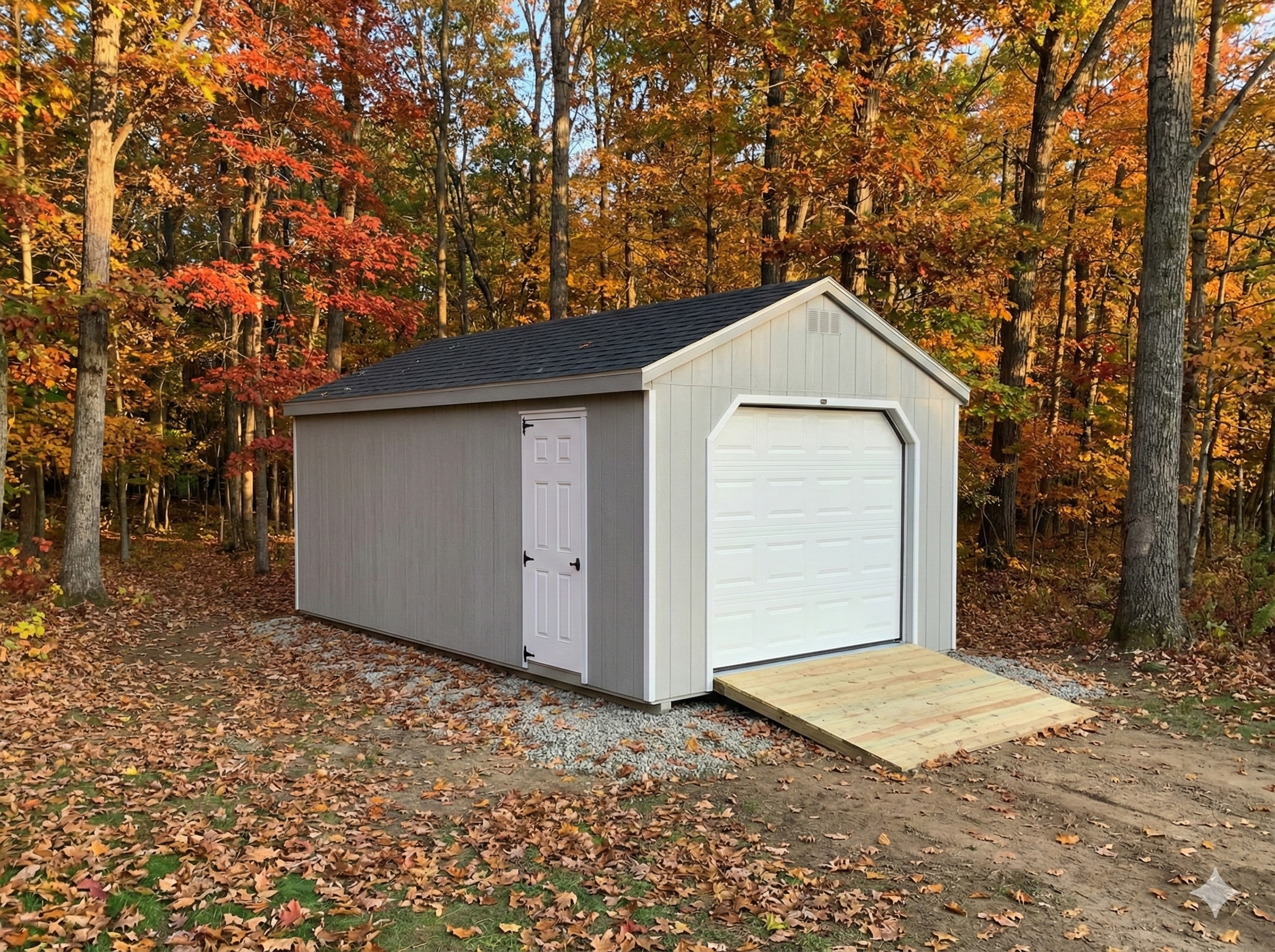 A rugged, Maine-ready A-frame garage built to protect your vehicle, side-by-side, or tools from harsh weather. Features an 8Ă—7 overhead door, side entry, and transom windows for natural light. Durable construction and Maine delivery included make it a practical, year-round storage solution.