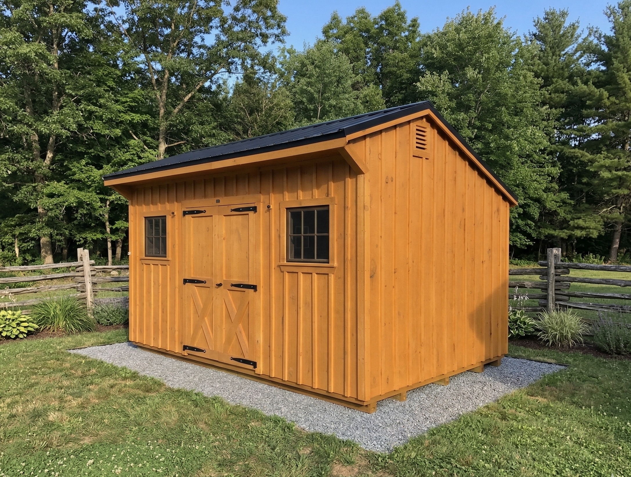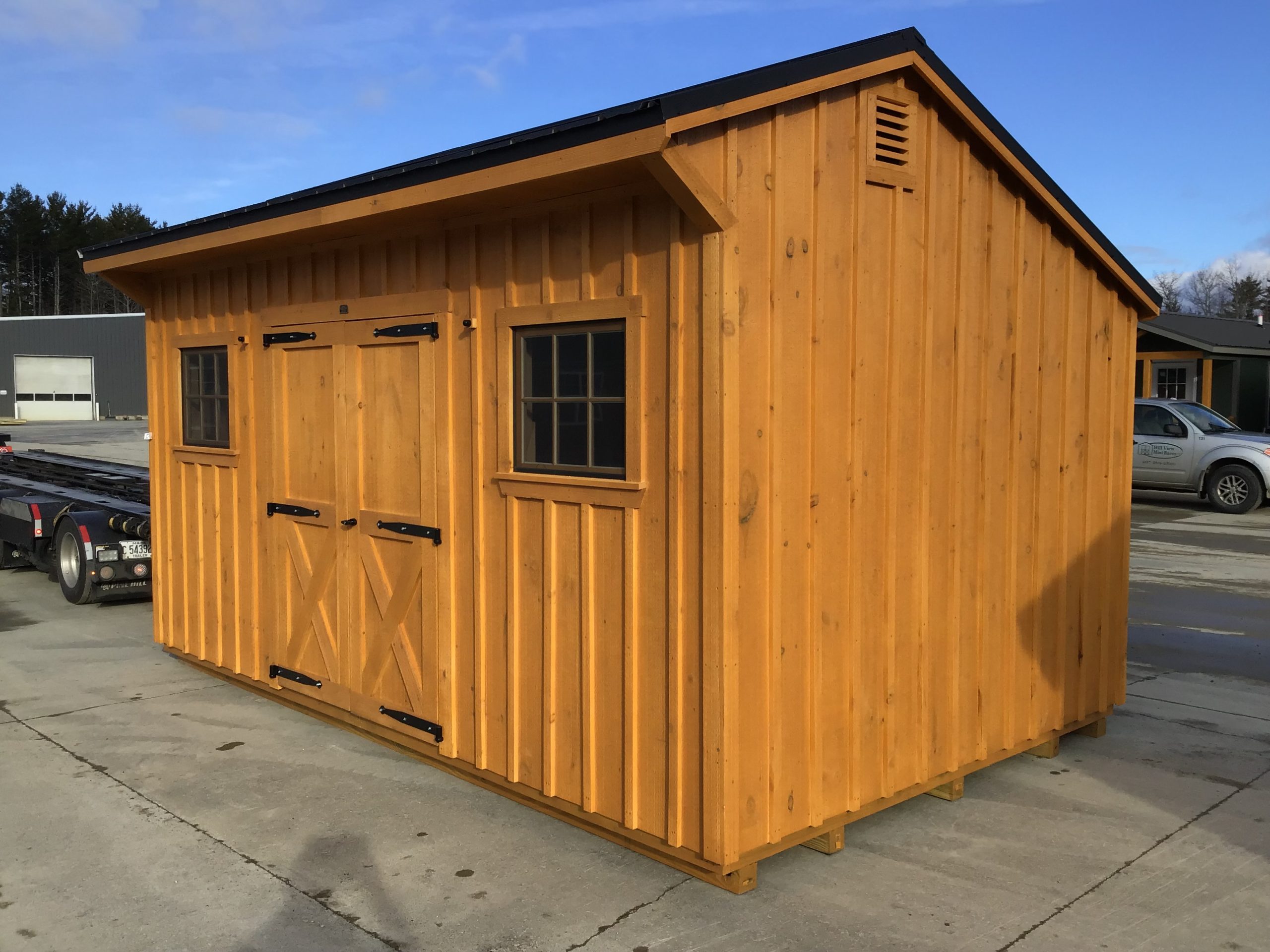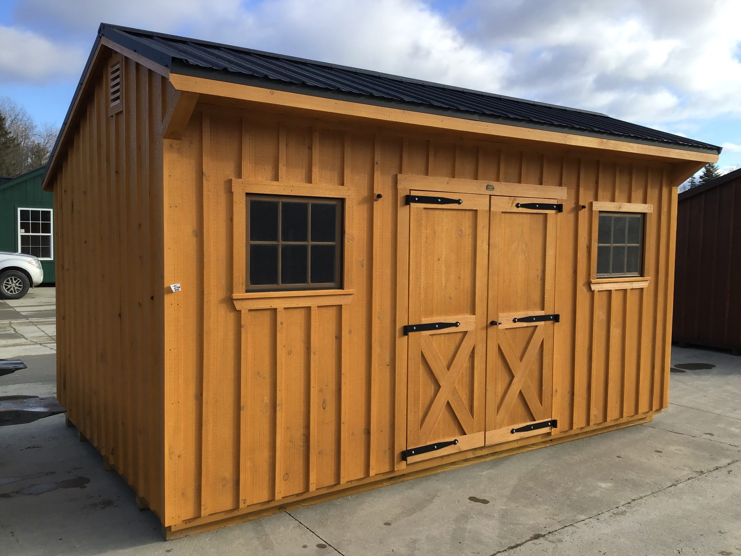 This storage building offers a dependable and practical solution for keeping tools, equipment, and outdoor items organized. Built to last on 5 pressure treated 4×4 skids, it features beautiful pine board and batten siding, 5′ double doors with ramp, windows for natural light and post and beam style framing.
