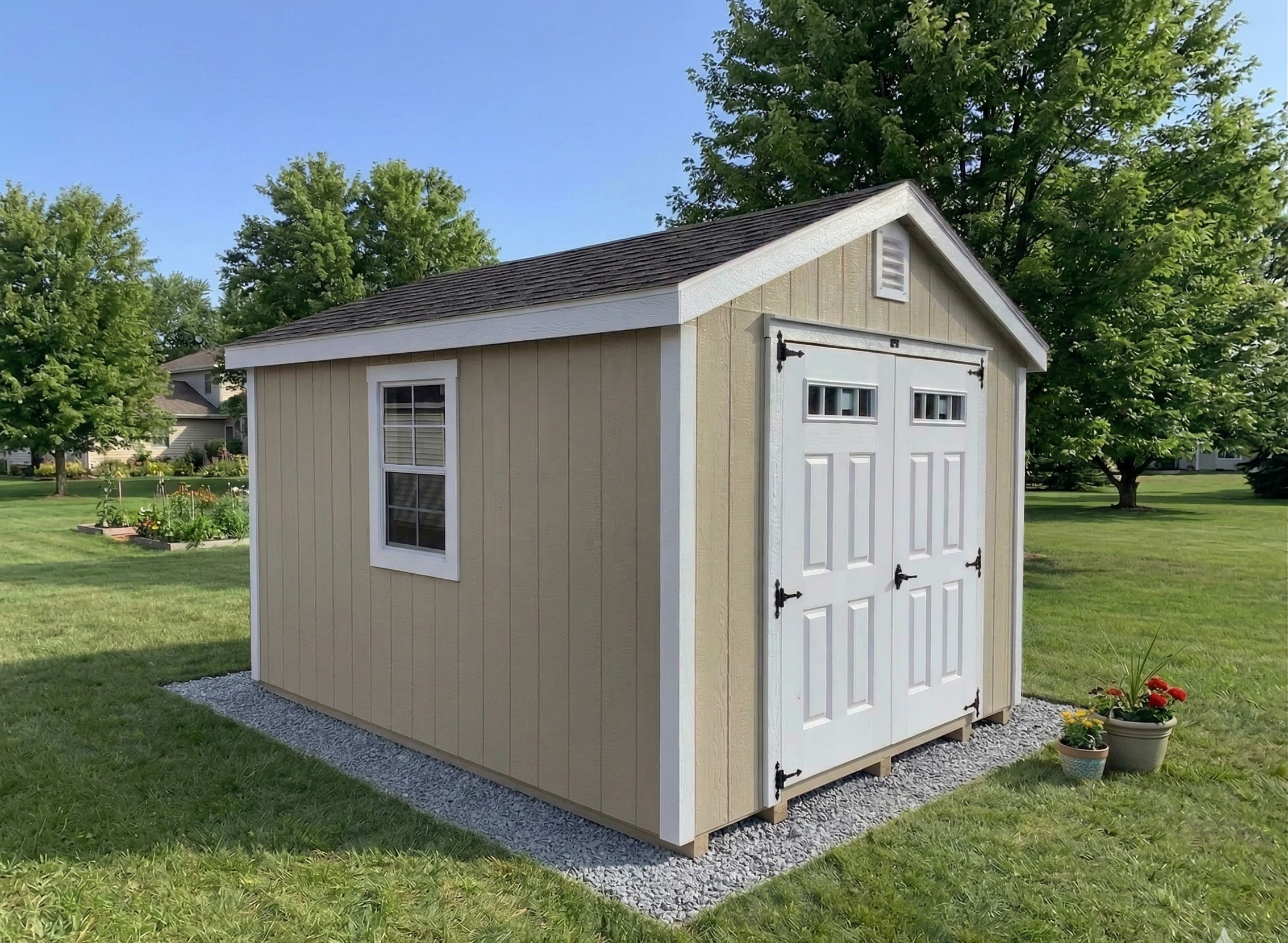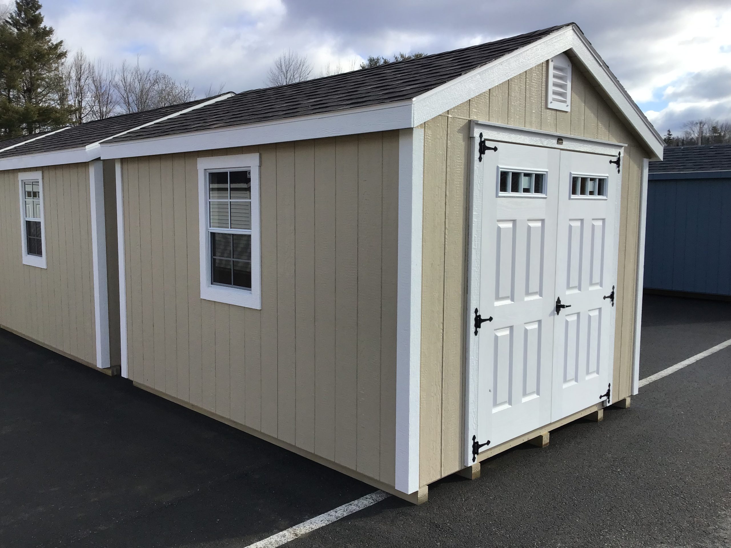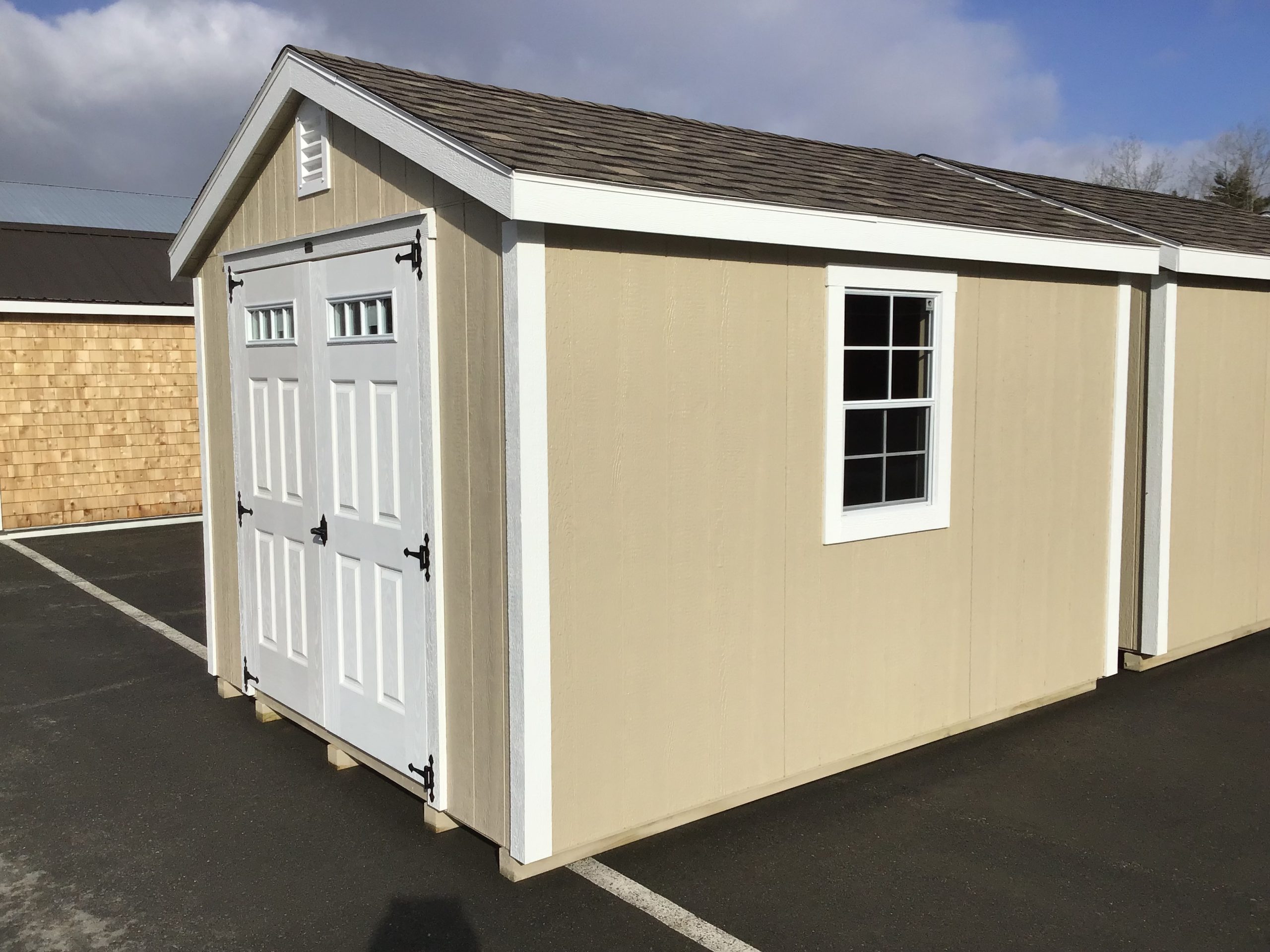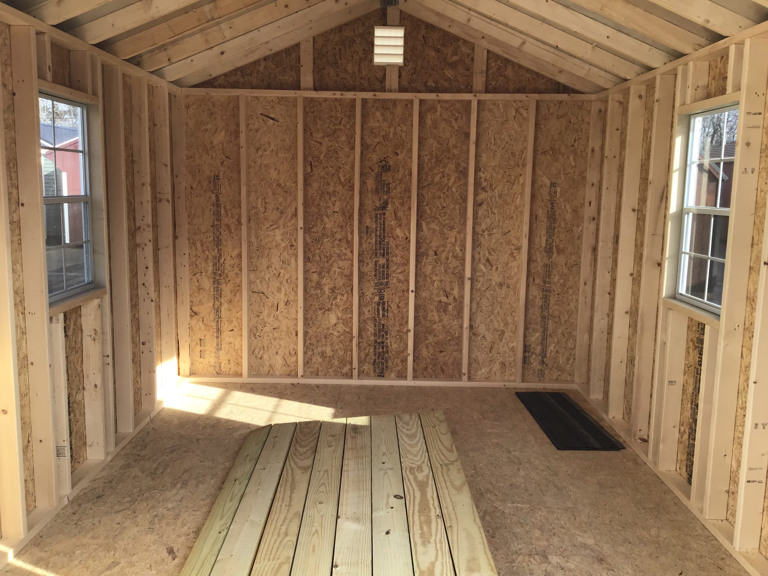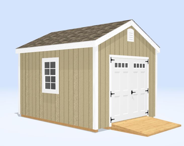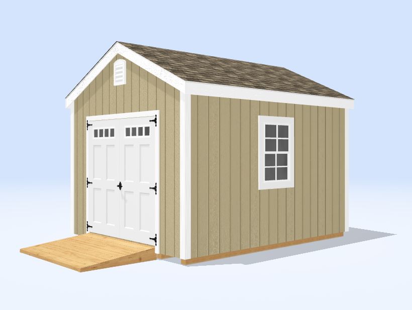 This 10×12 storage shed offers a reliable and efficient solution for organizing tools, equipment, and outdoor essentials. Built on 5 pressure treated 4×4 skids, it features 6′ double doors with a pressure treated ramp and windows for natural light.