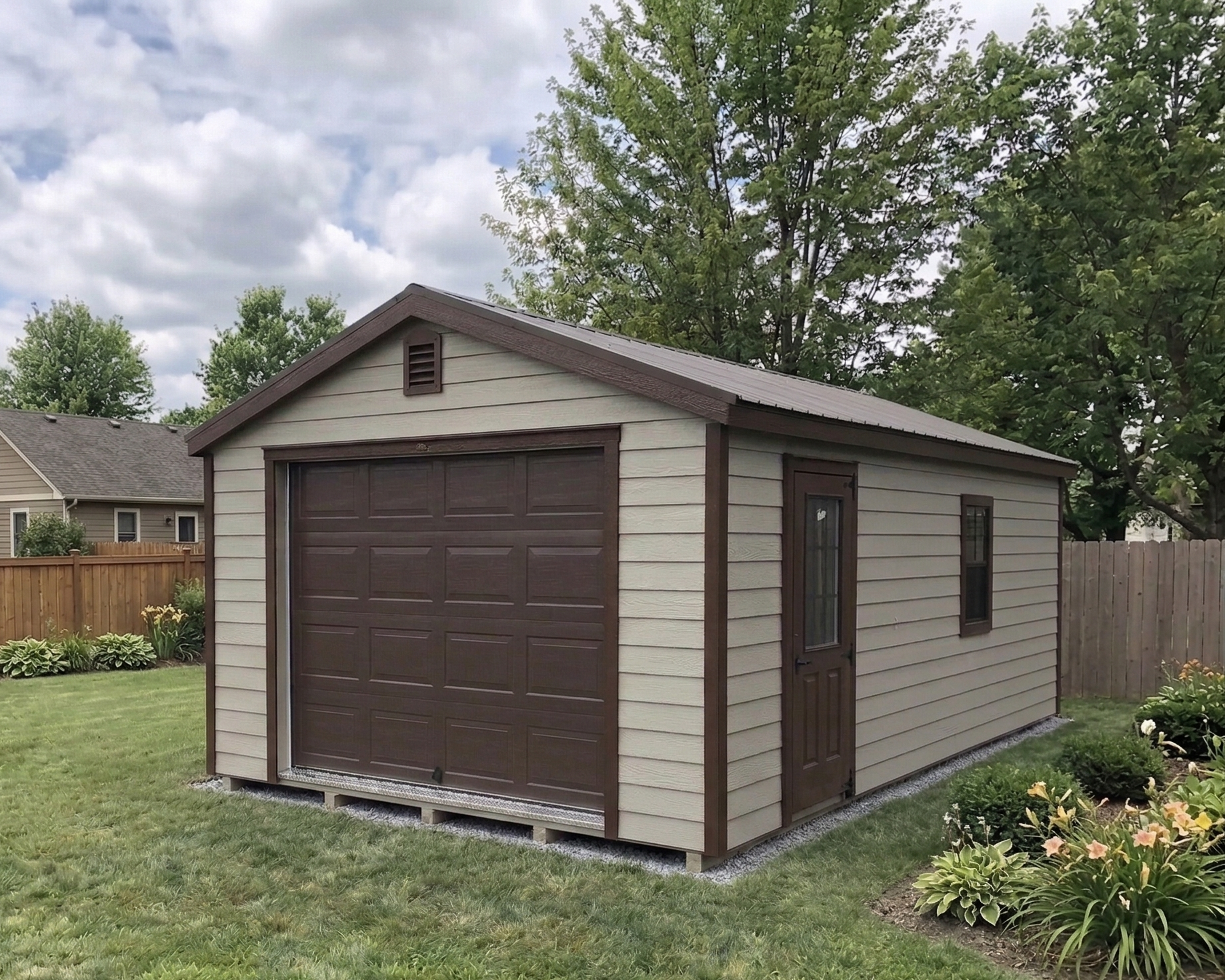 This 13’4”x24’ garage offers spacious and dependable protection for vehicles, equipment, and tools. Built with quality craftsmanship, it features 5 pressure treated 4×4 skids, a 9×7 overhead door with a pressure treated ramp, windows for natural light and a 4′ loft.
