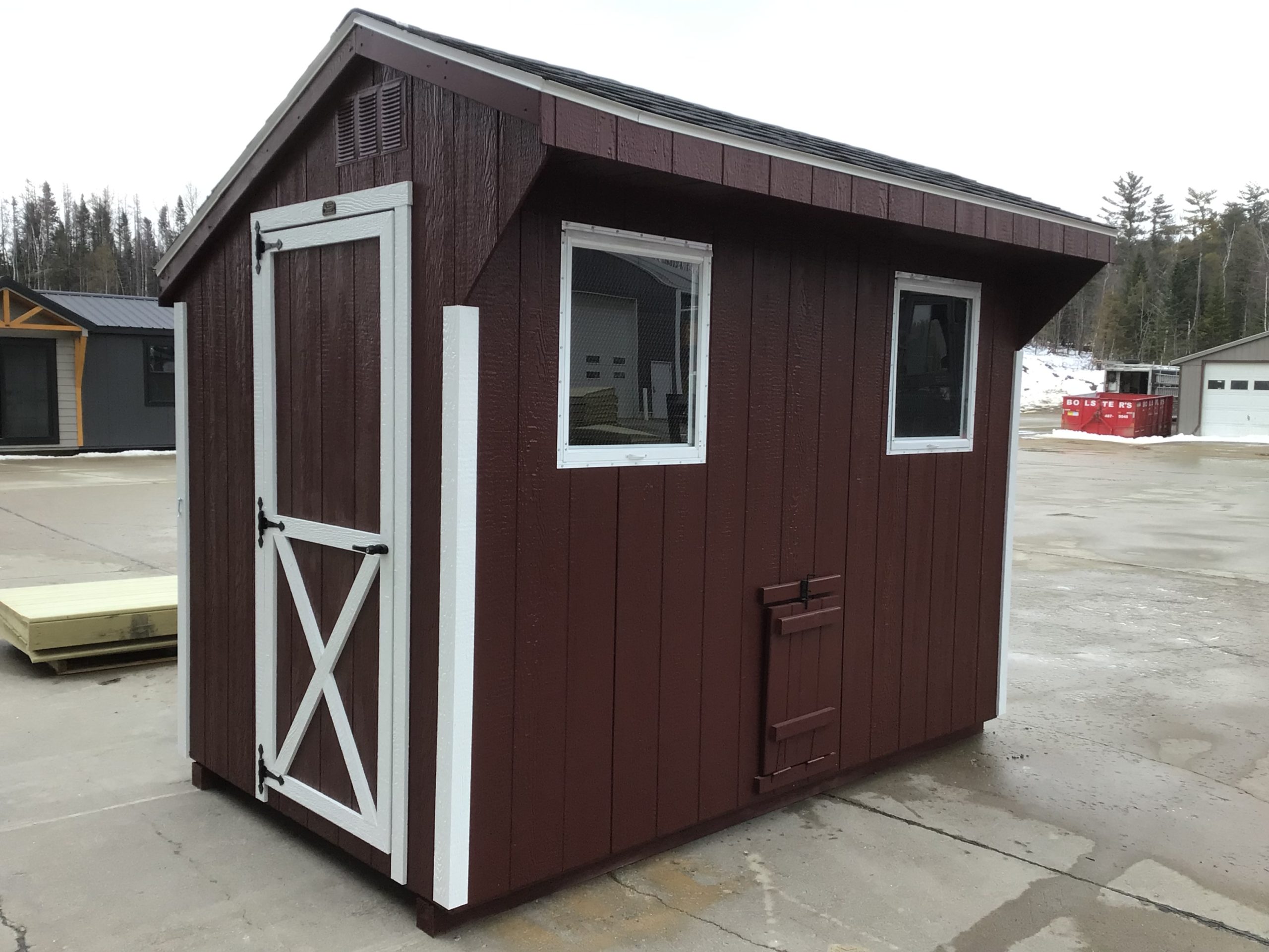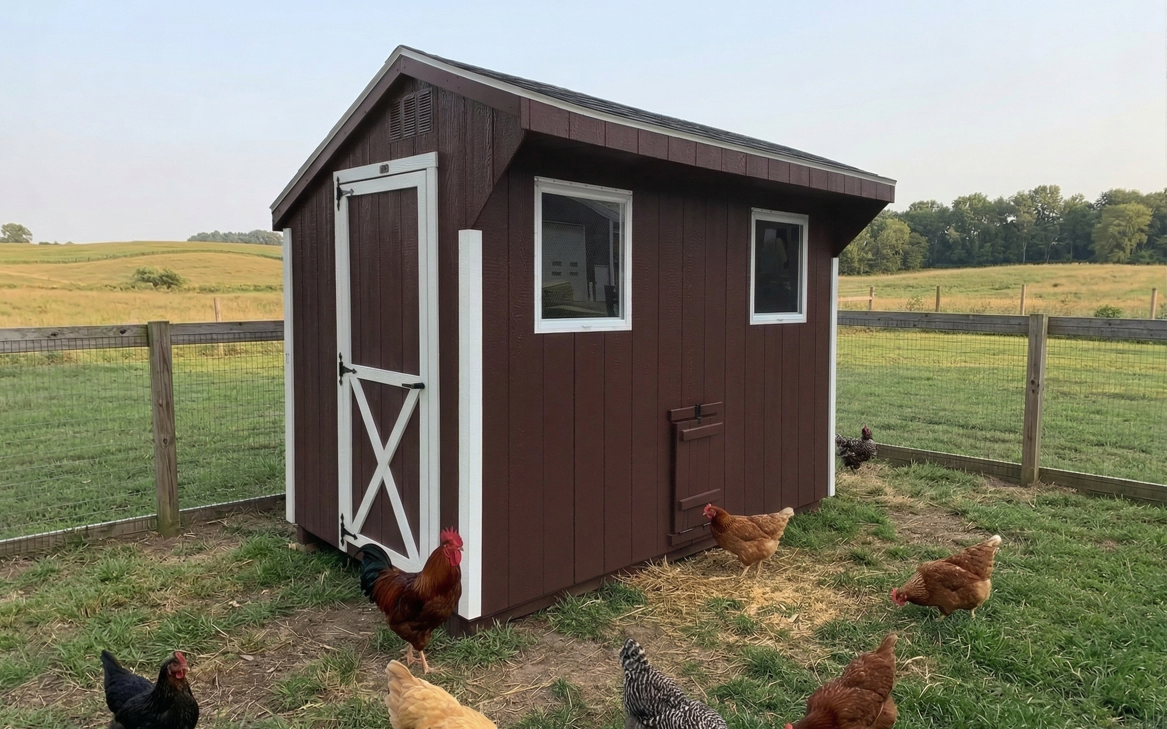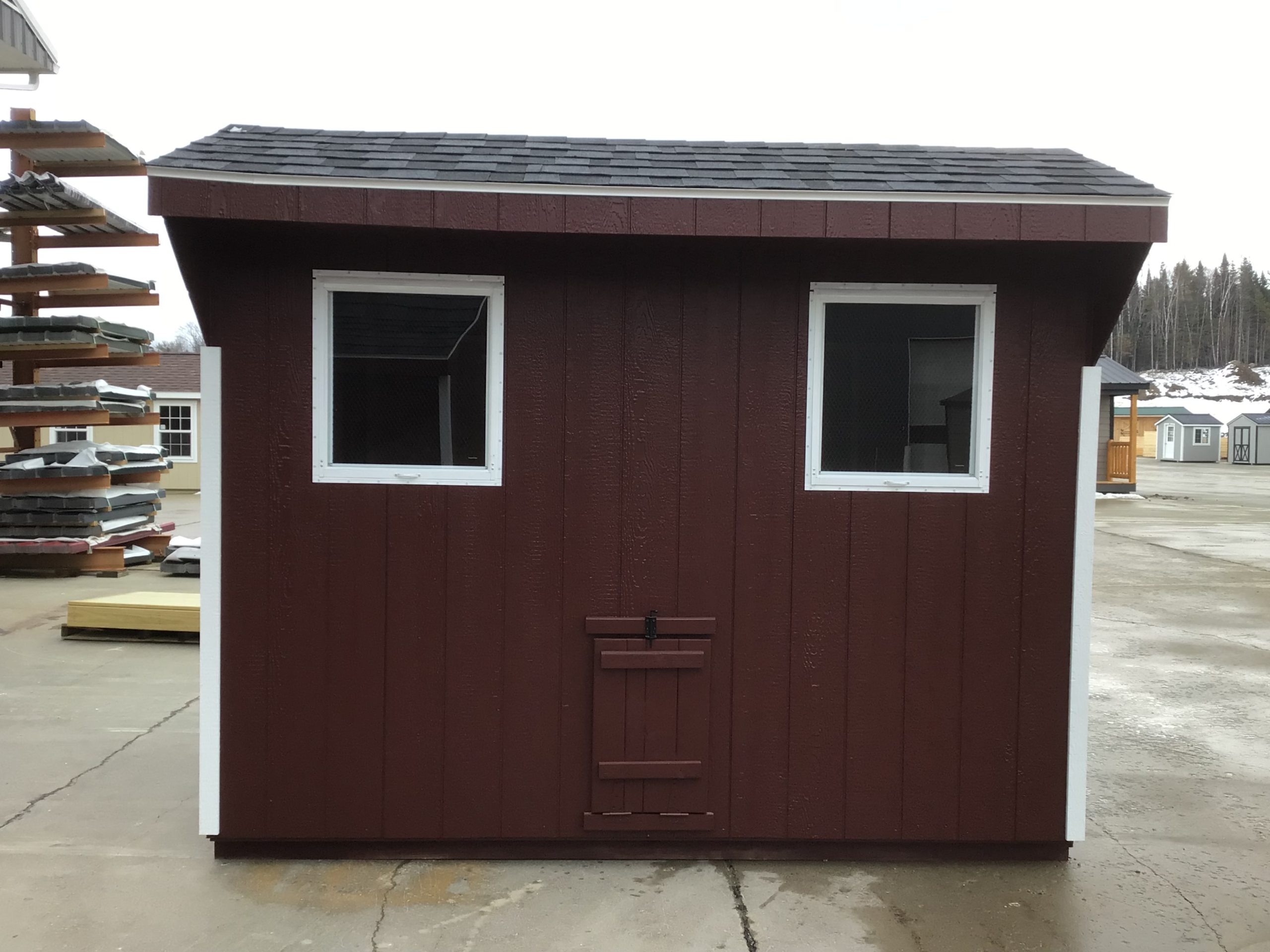 This 6×10 chicken coop offers a practical and comfortable space for your flock. Built to last on two pressure treated skids, it features a chicken door with ramp, nesting boxes, roosting space, and ventilation windows.