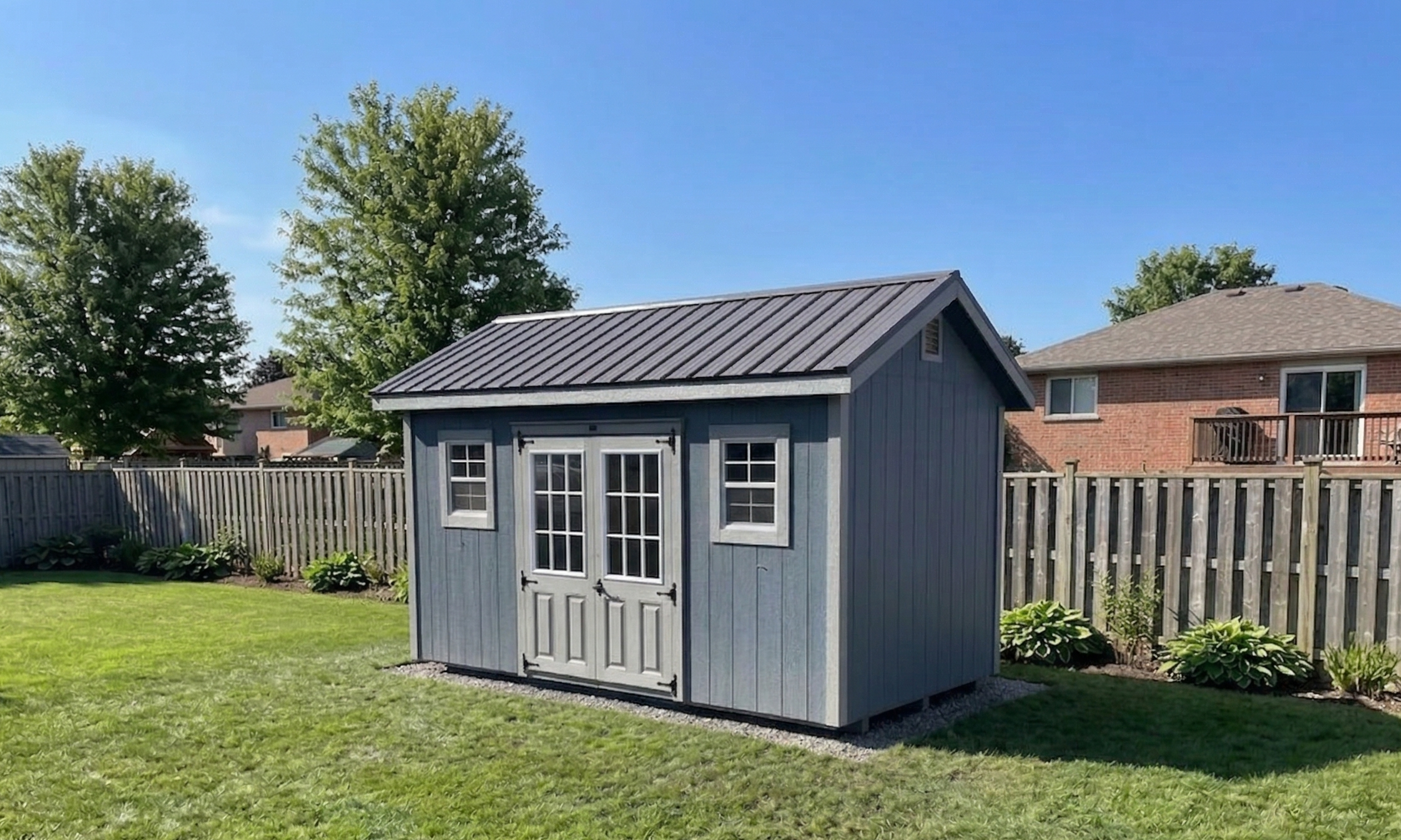 This 8×14 storage building offers a dependable solution to your backyard storage needs. Built to last on three pressure treated skids, it features 5′ double doors, a pressure treated ramp, windows for natural light, and additional customer-added R-11 insulation.