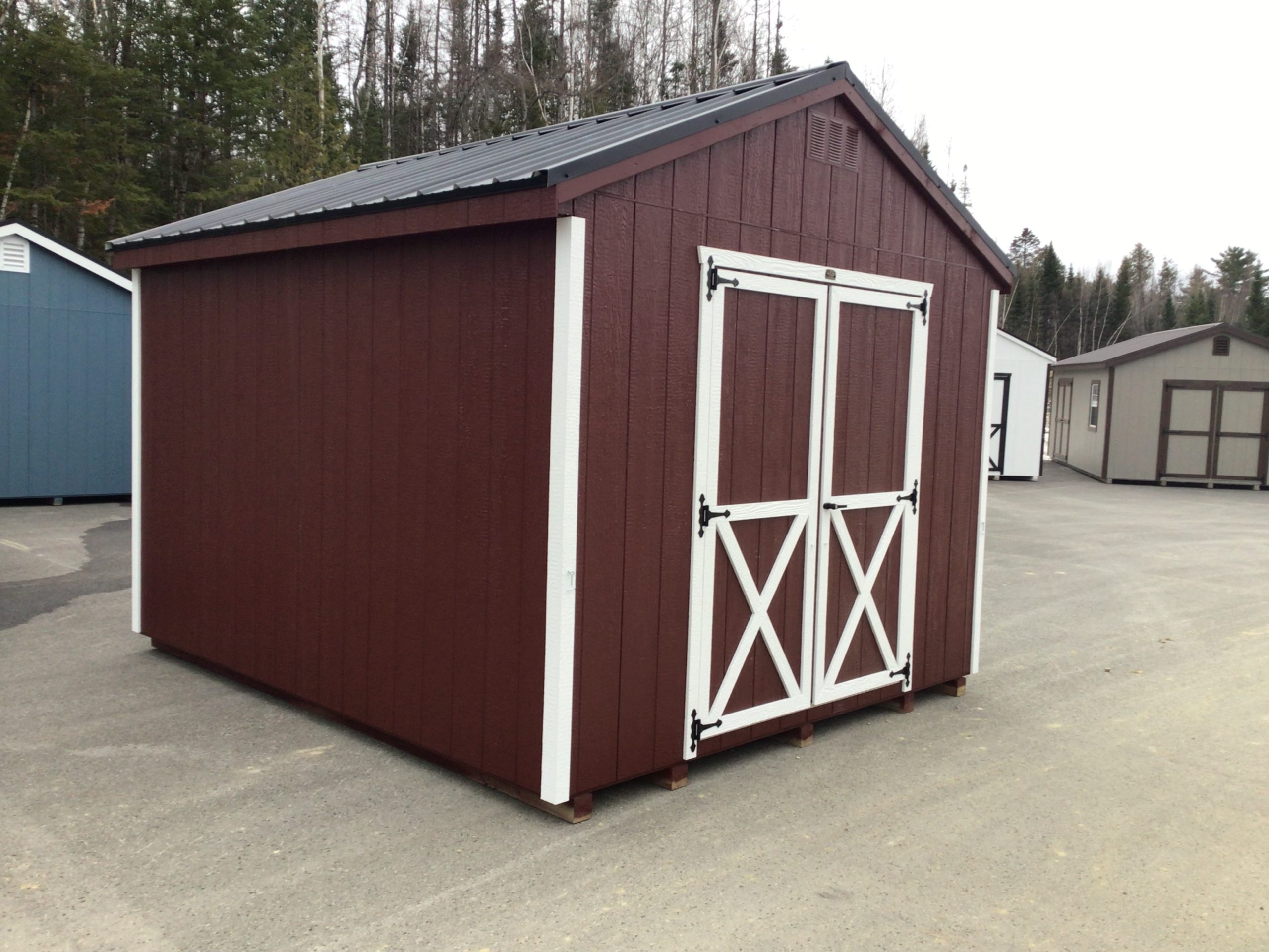 This 10×12 storage shed offers a practical and dependable solution for organizing tools, lawn equipment, and projects. Built with quality craftsmanship, it features 5 pressure treated 4×4 skids, 5′ double doors and a pressure treated ramp.