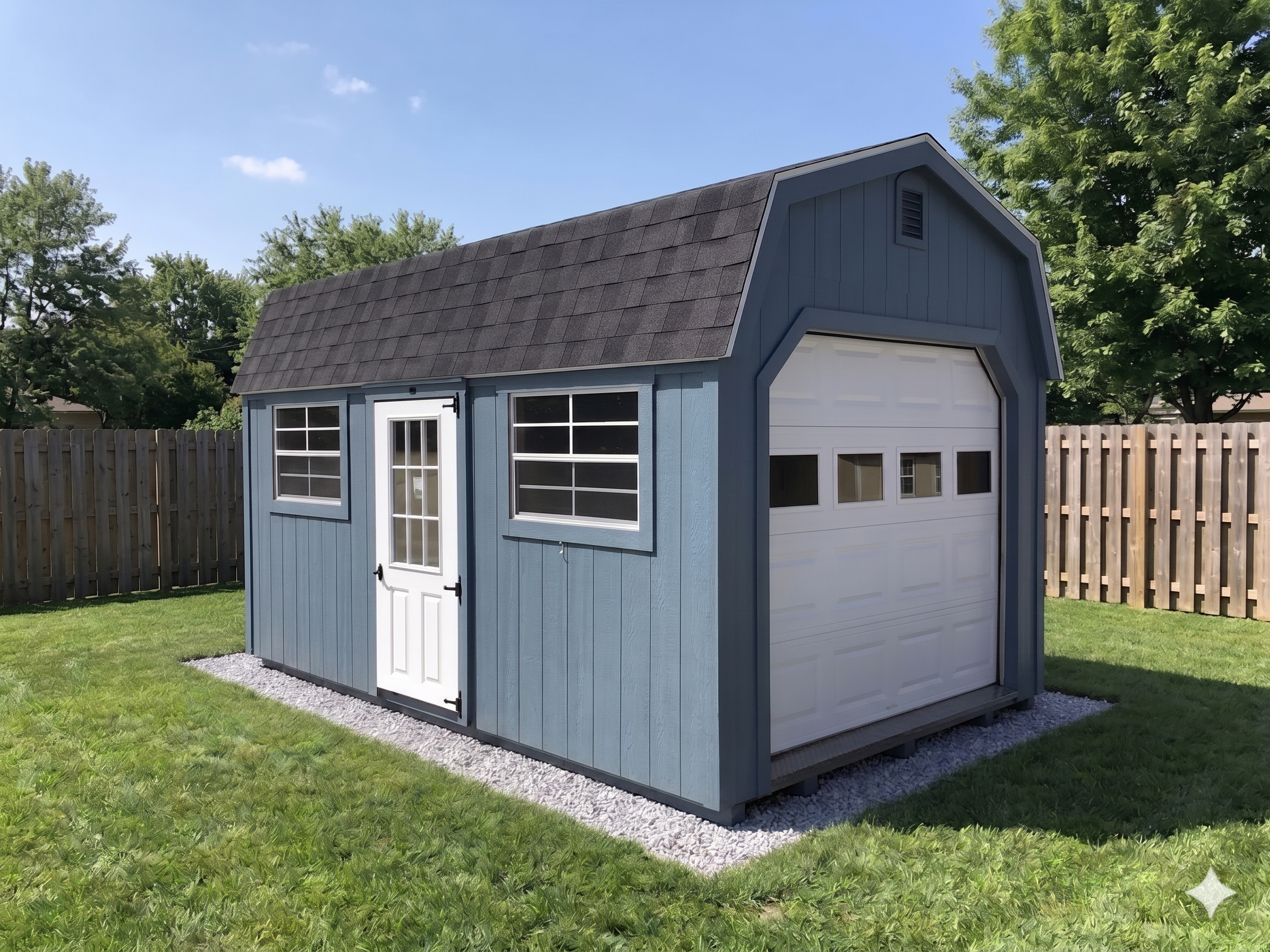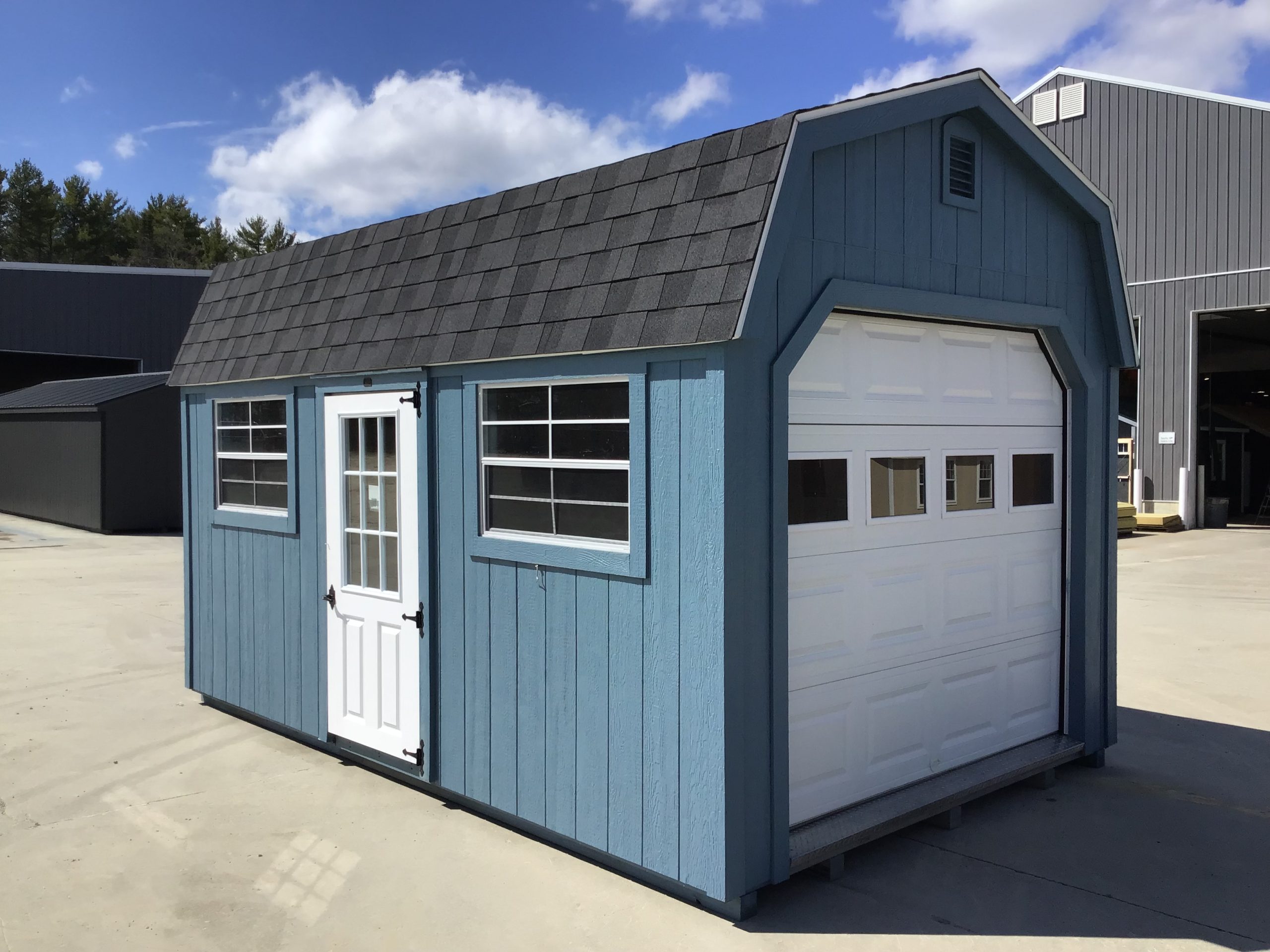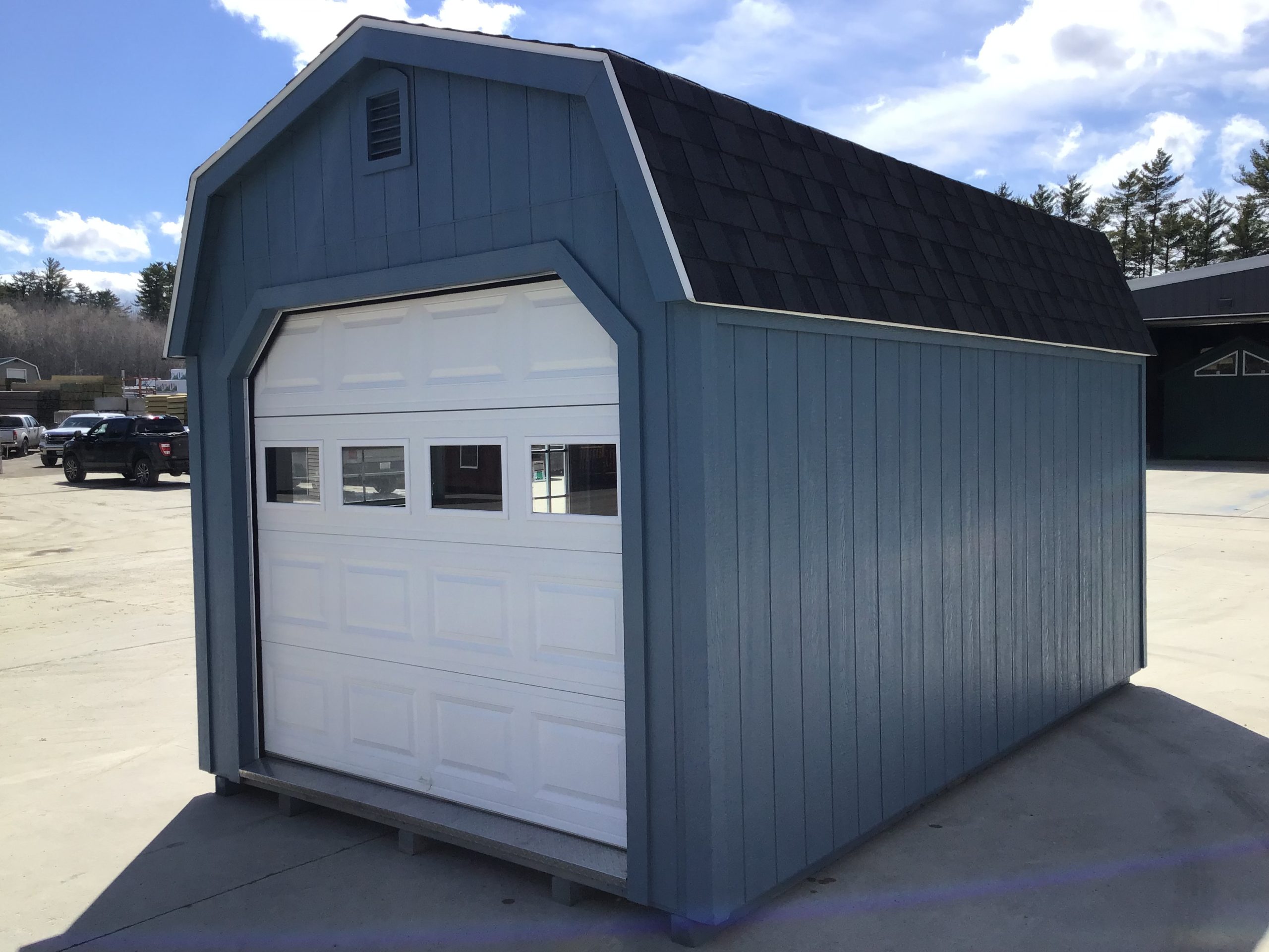 Give your backyard an upgrade with this used 10×16 High Side Plus gambrel garage, featuring a 8×7 overhead door, sturdy ramp, side entry and windows. Delivery to Maine locations is included, so you can have a quick, hassle-free solution to your storage needs.